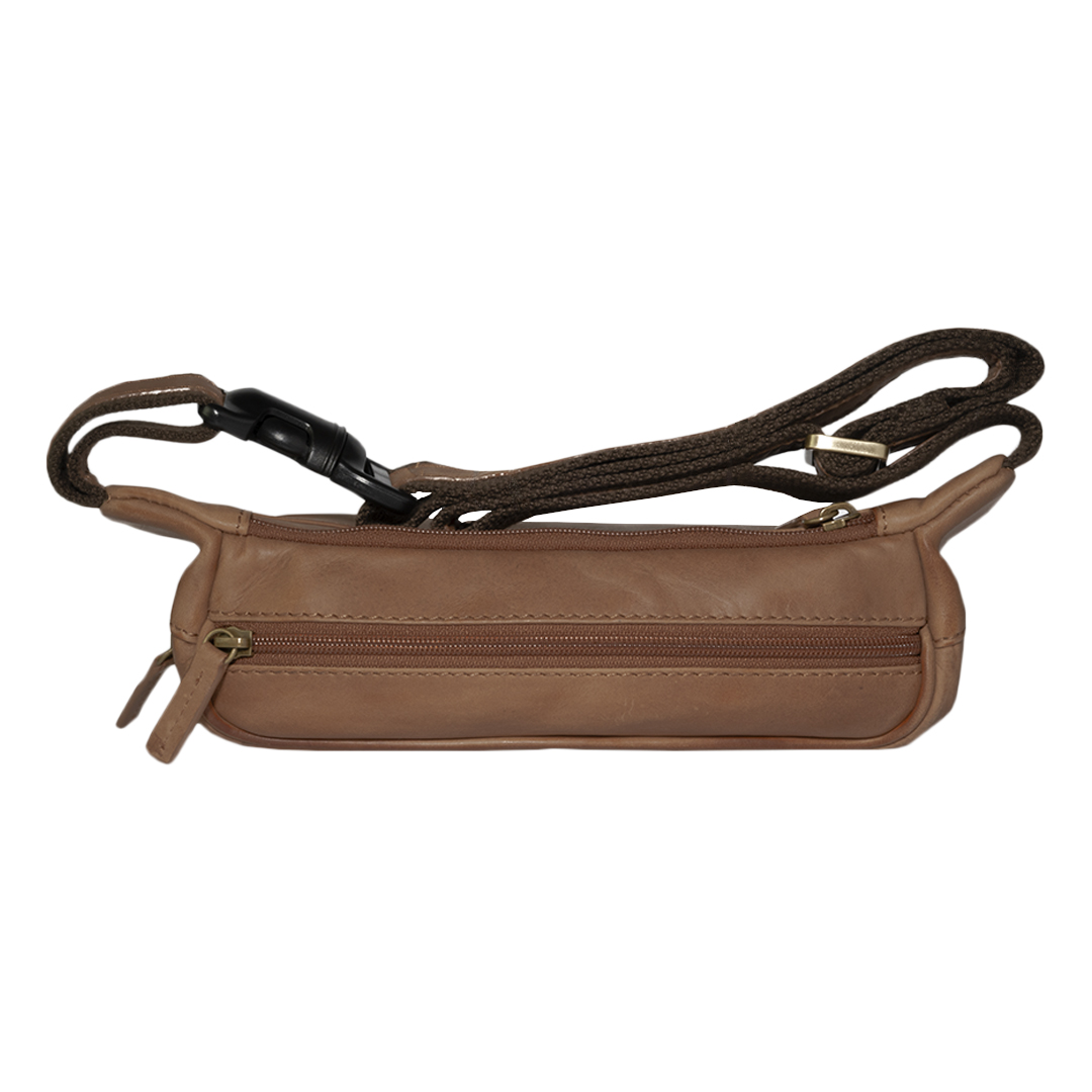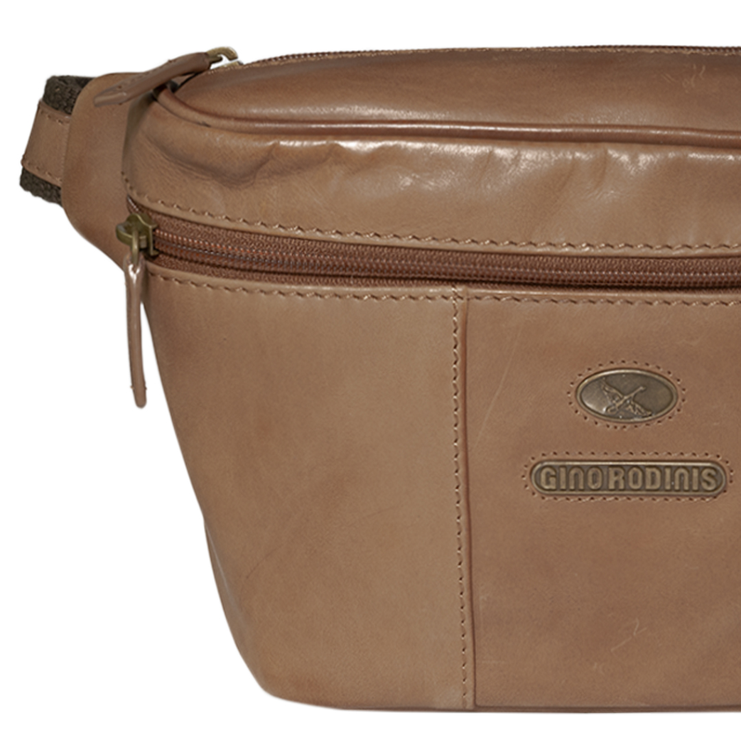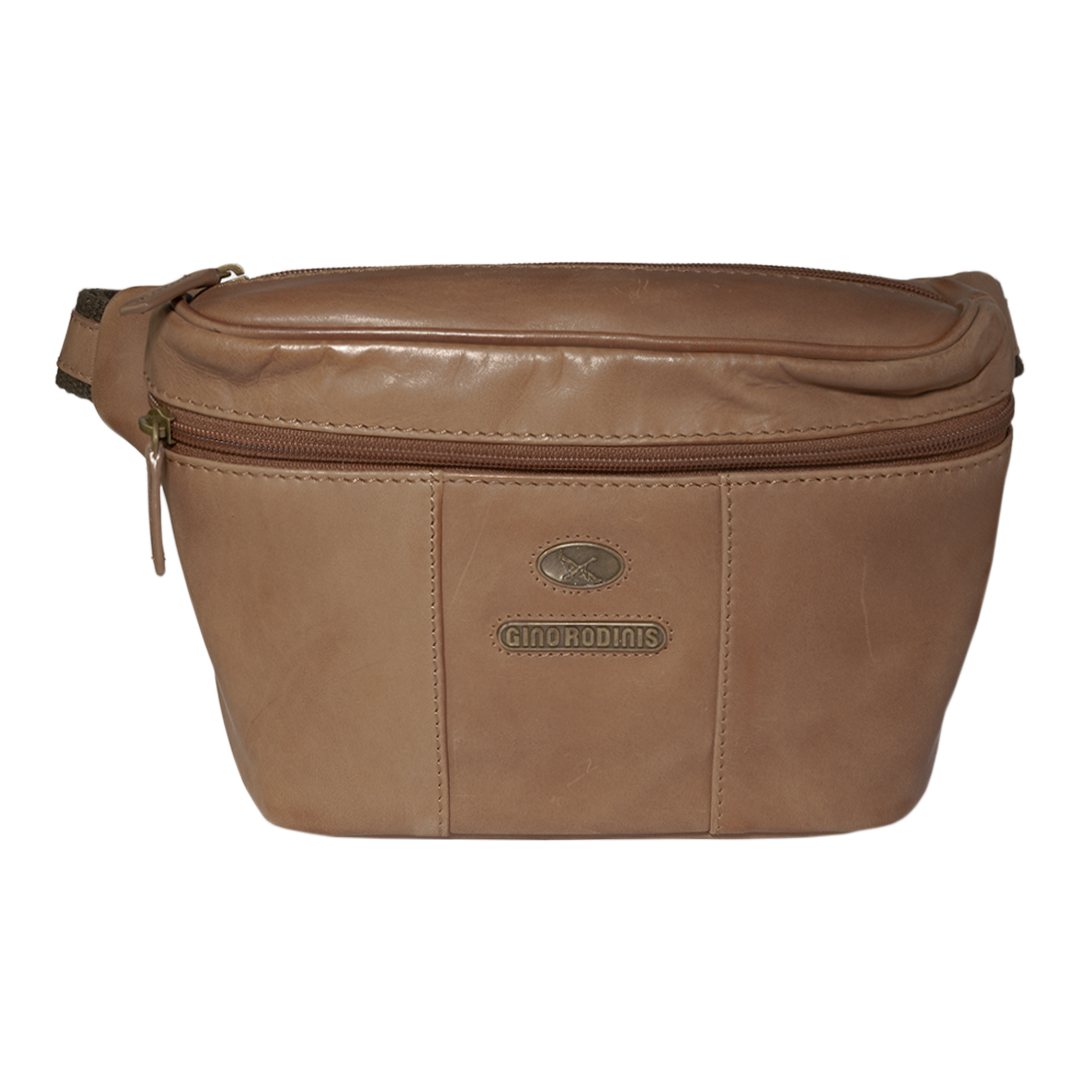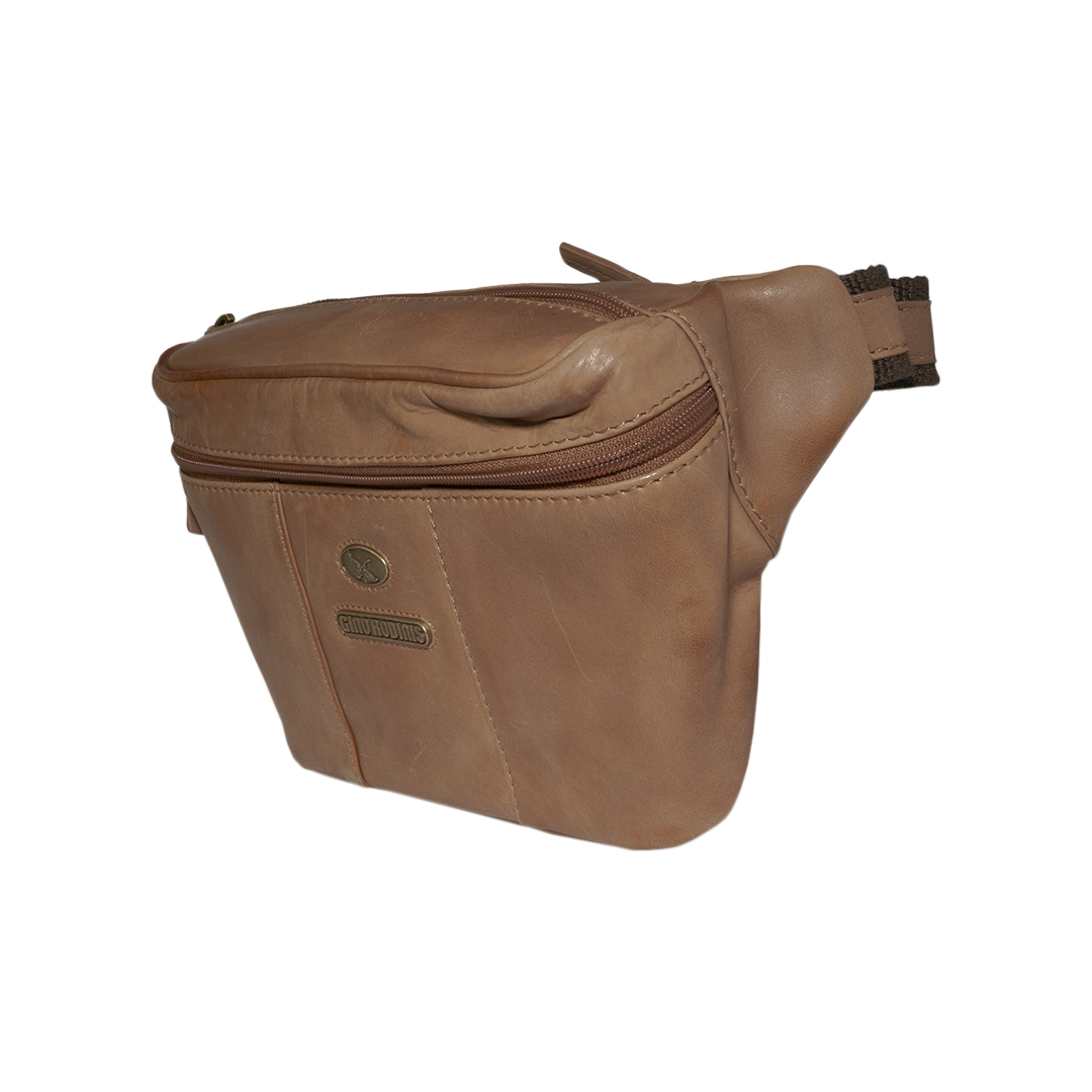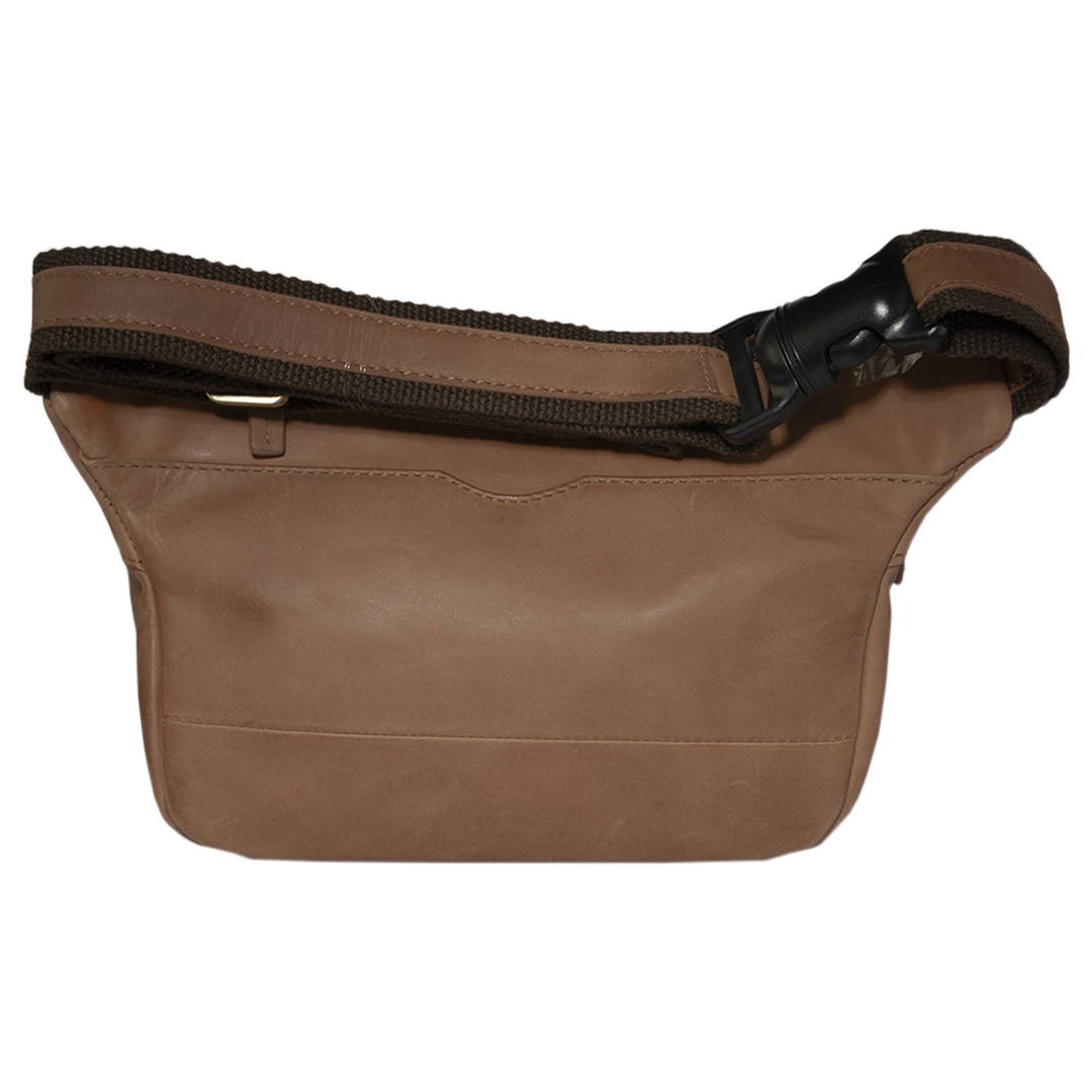 Banano de cuero camel inspirado en la moda italiana. Diseño elegante y funcional con bolsillos con cierre y correa ajustable.