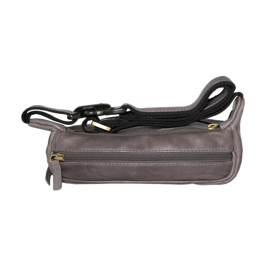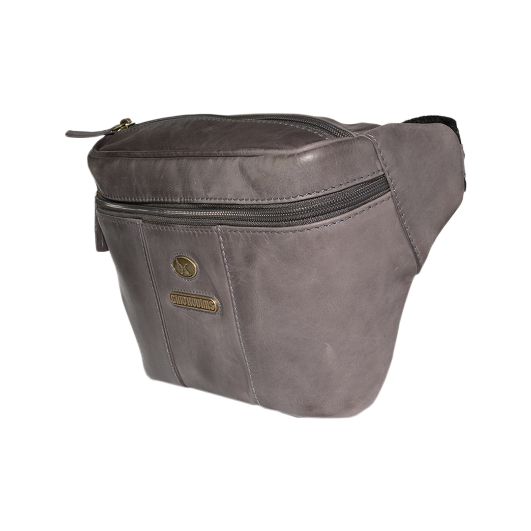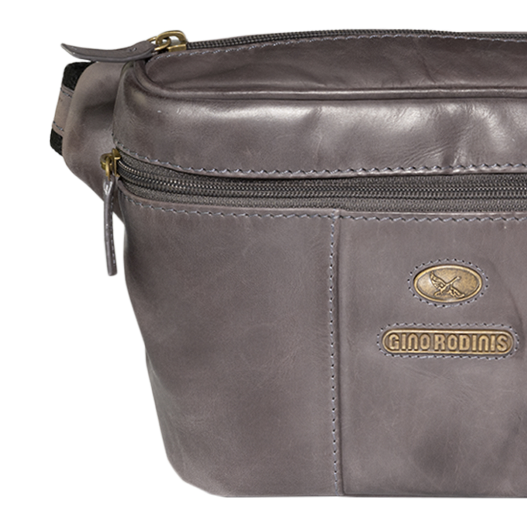 Banano de cuero gris inspirado en la moda italiana. Diseño elegante y funcional con bolsillos con cierre y correa ajustable.