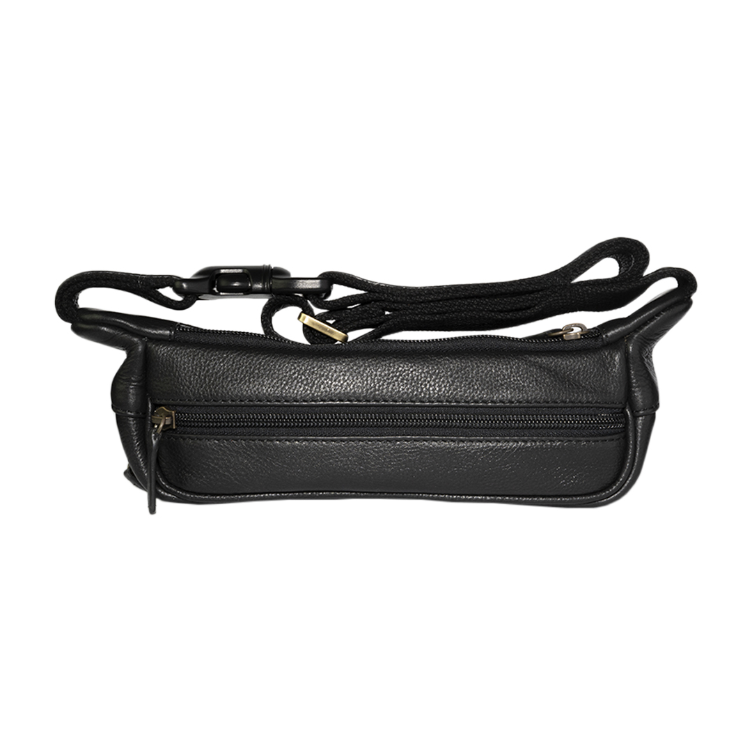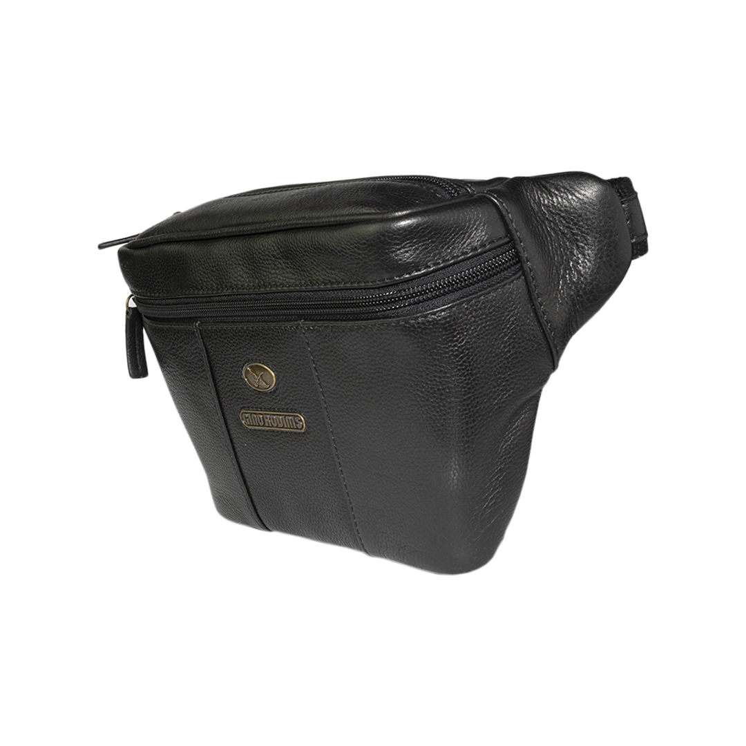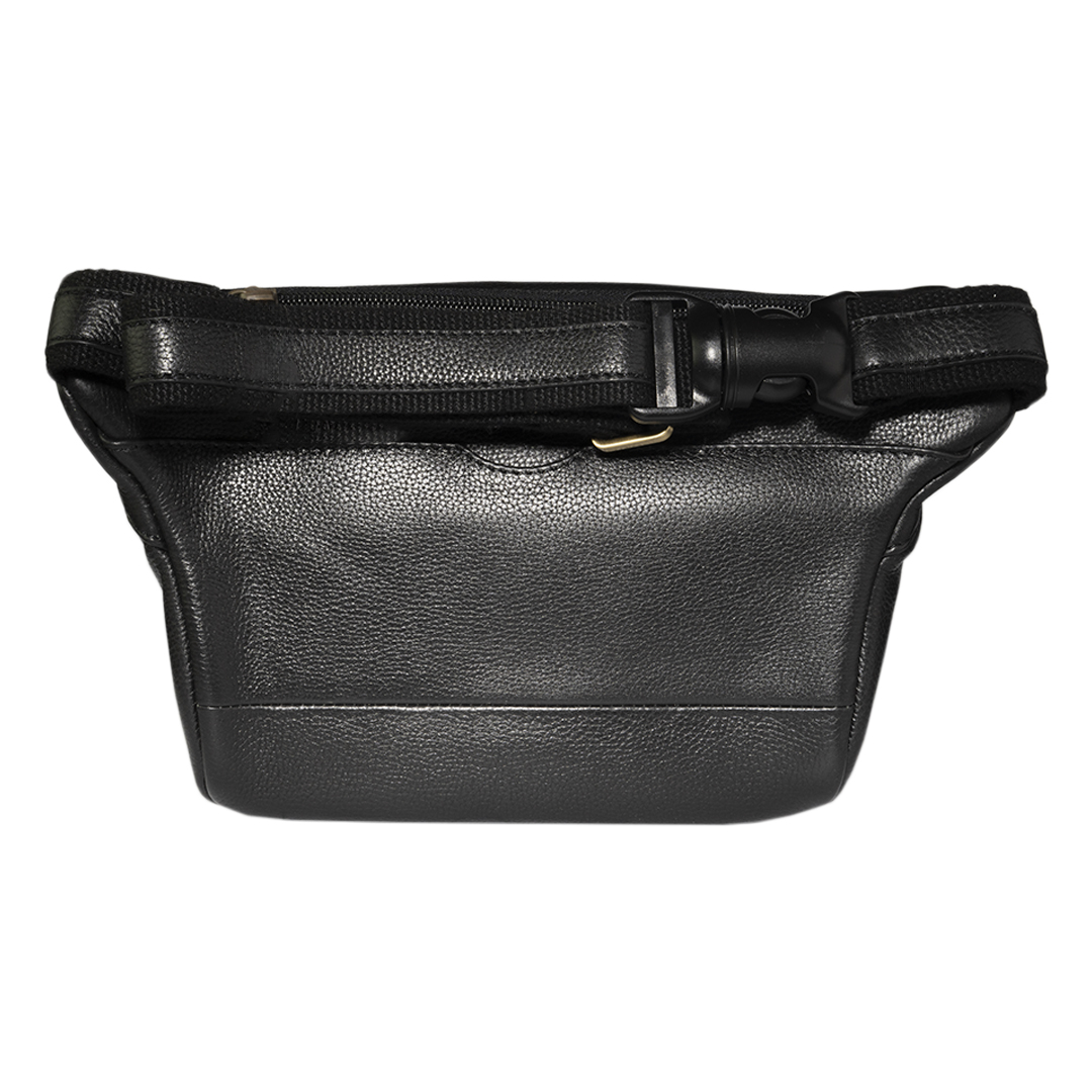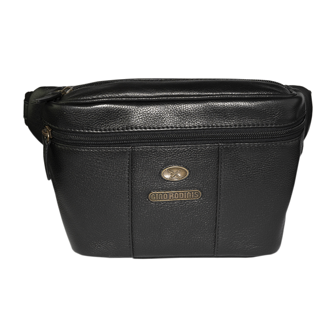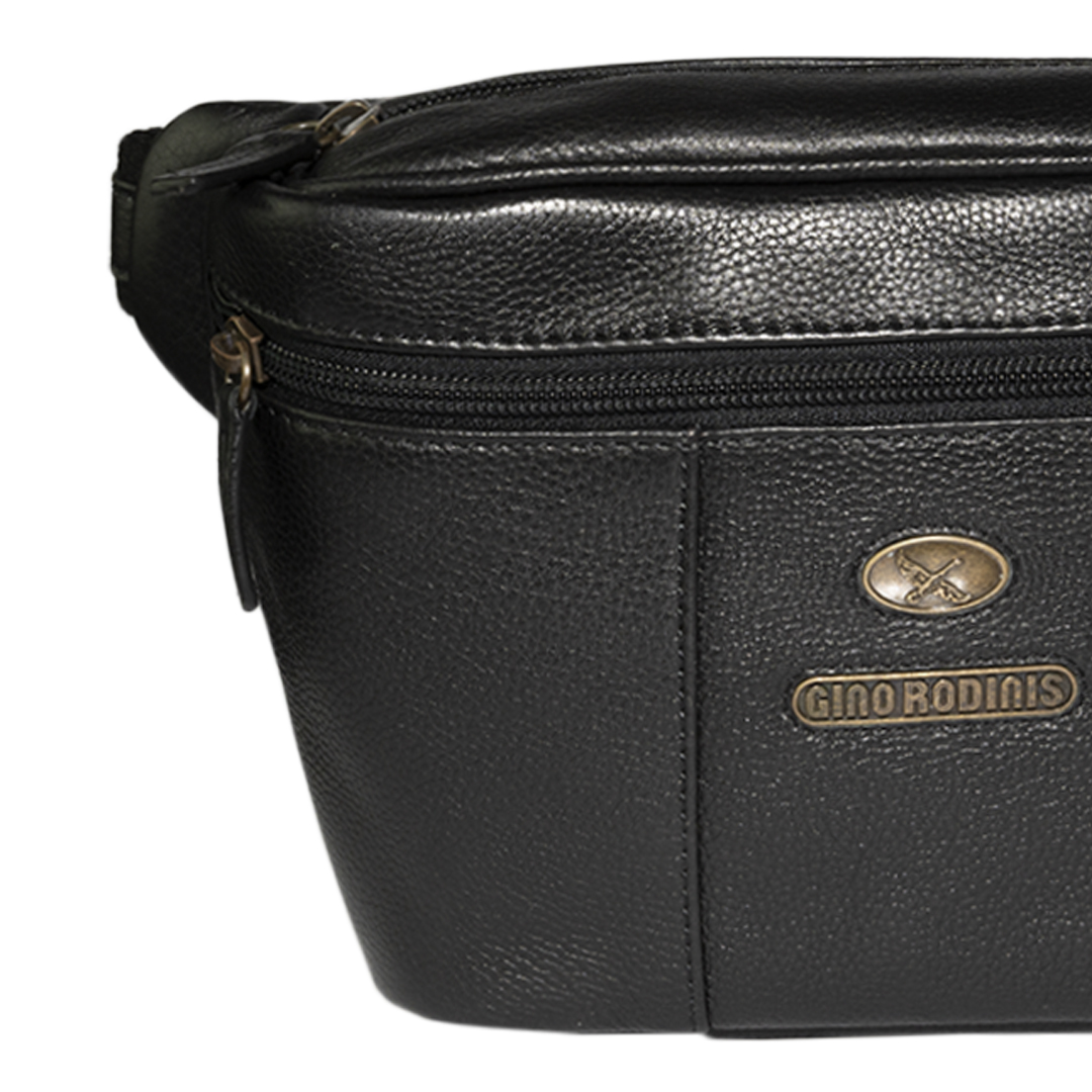 Banano de cuero negro inspirado en la moda italiana. Diseño elegante y funcional con bolsillos con cierre y correa ajustable.