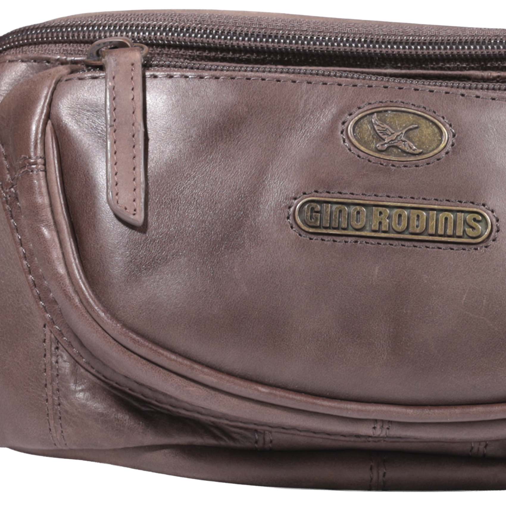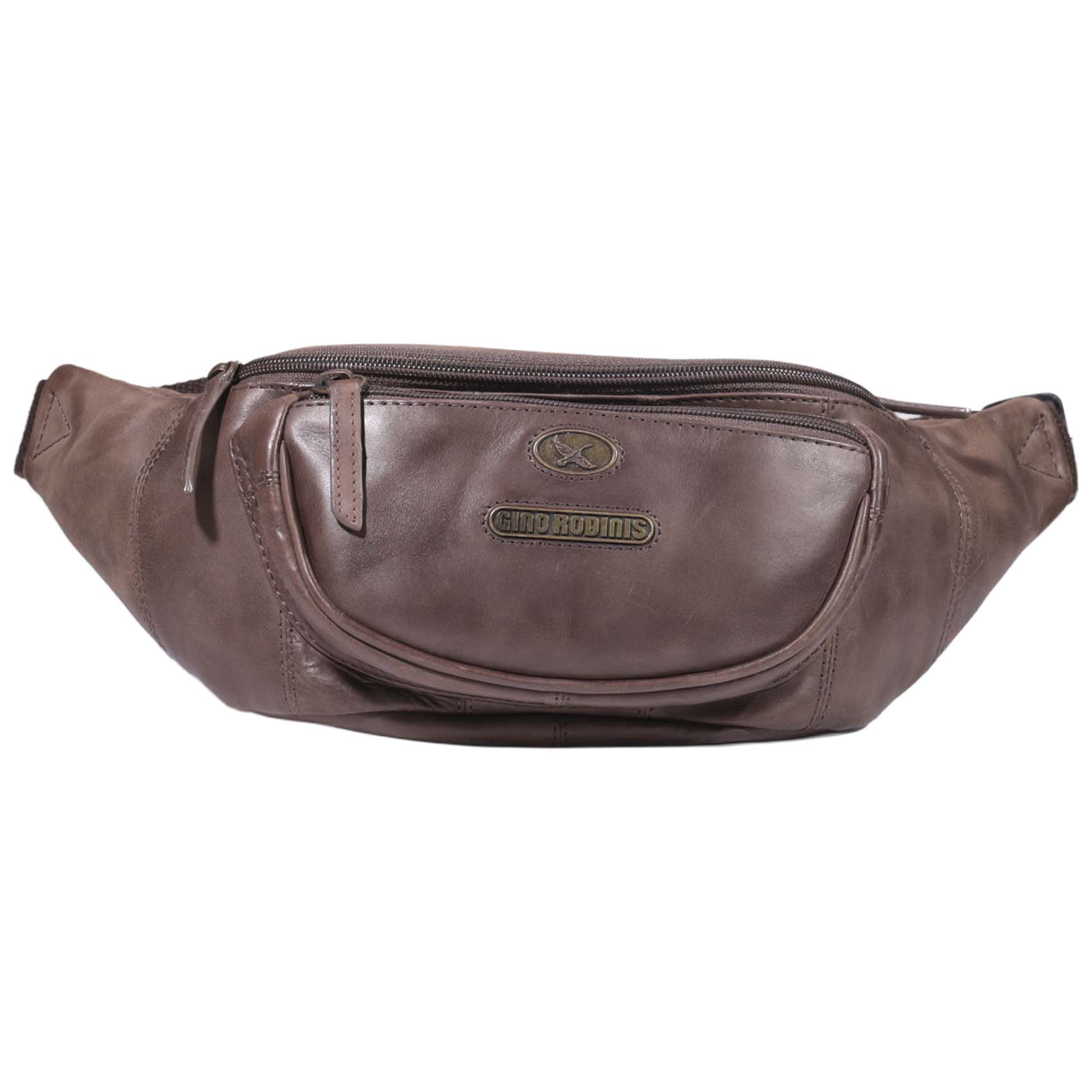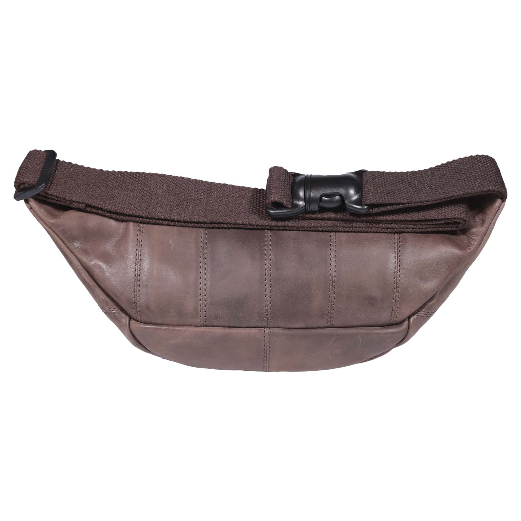 Banano de cuero café con diseño italiano. Sofisticado y funcional, con bolsillos con cierre y correa ajustable para mayor comodidad.