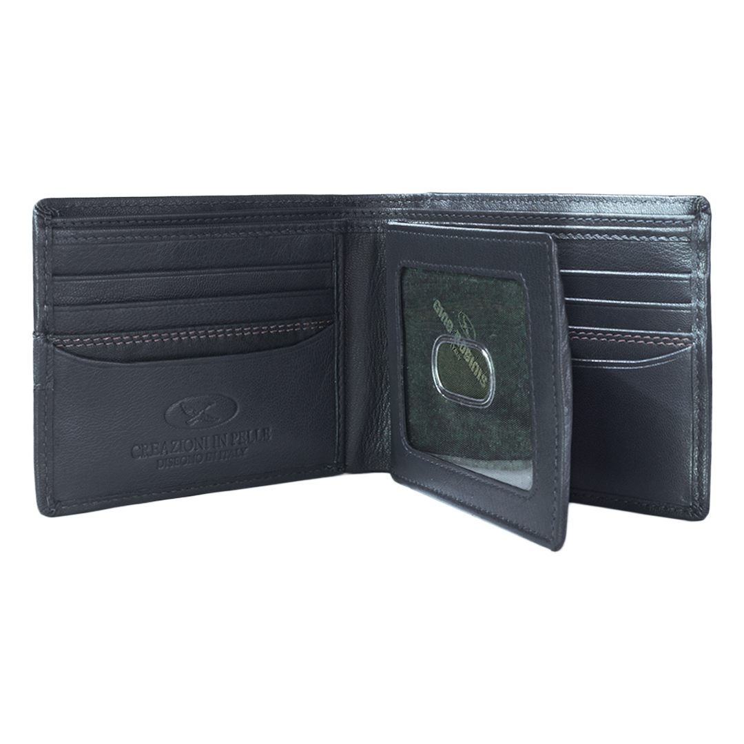 BILLETERA DE CUERO CON TECNOLOGÍA RFID, DOBLE COSTURA CENTRAL Y LOGO METÁLICO. 12 TARJETEROS Y DOBLE COMPARTIMIENTO PARA BILLETES.
