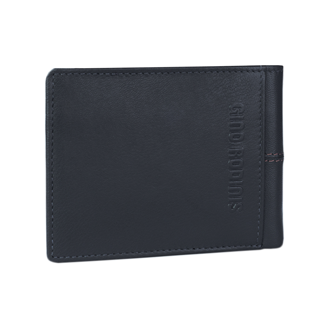 BILLETERA DE CUERO CON TECNOLOGÍA RFID, DOBLE COSTURA CENTRAL Y LOGO METÁLICO. COMPARTIMIENTOS PARA TARJETAS Y DOBLE ESPACIO PARA BILLETES.