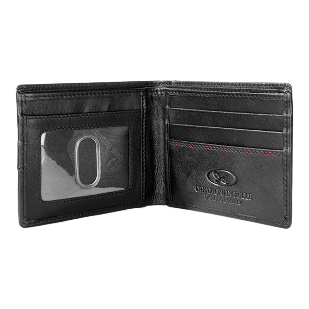 BILLETERA DE CUERO CON TECNOLOGÍA RFID, DOBLE COSTURA CENTRAL Y LOGO METÁLICO. COMPARTIMIENTOS PARA TARJETAS Y DOBLE ESPACIO PARA BILLETES.