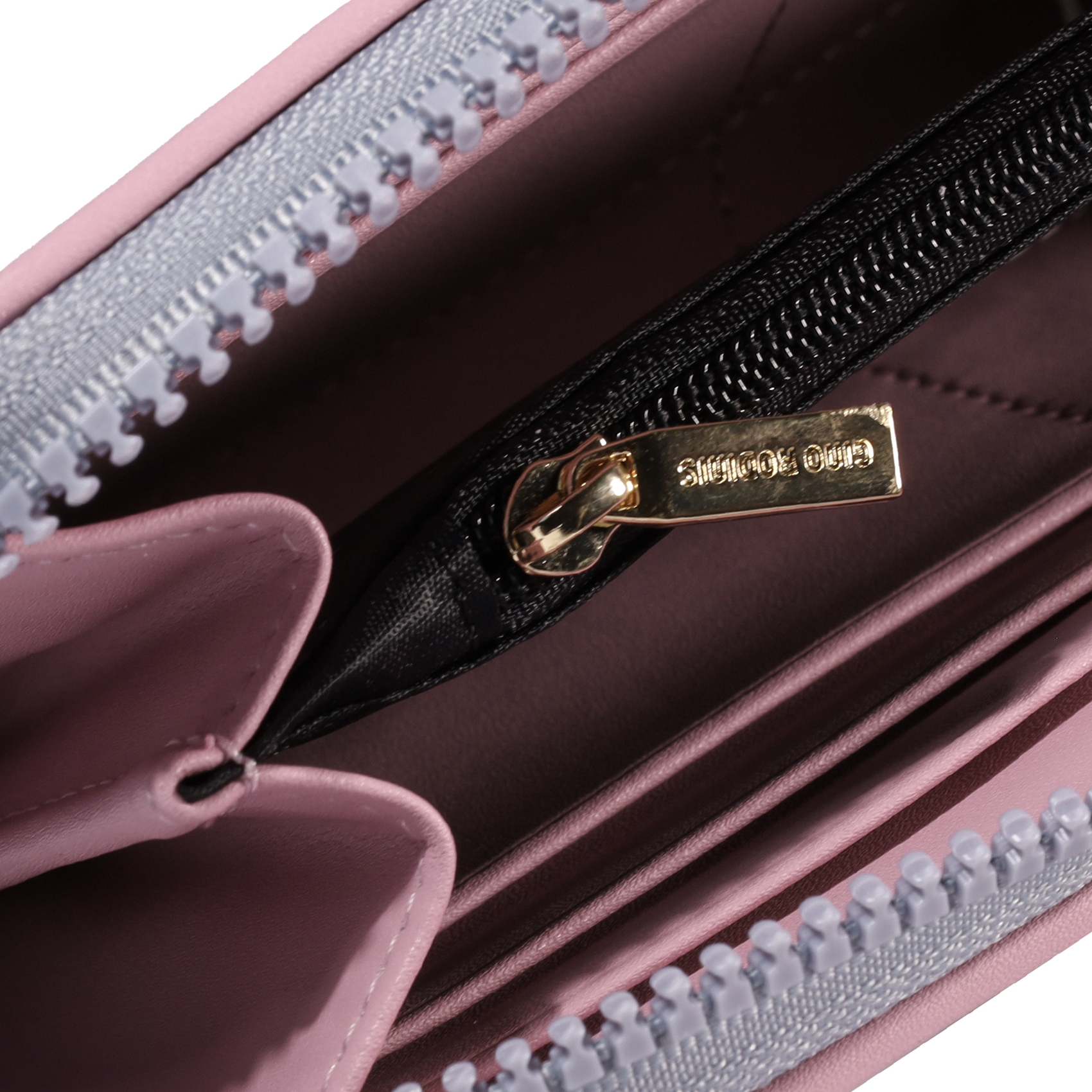 - Destacan el logos metálicos Gino Rodinis en el tono de la cremallera.