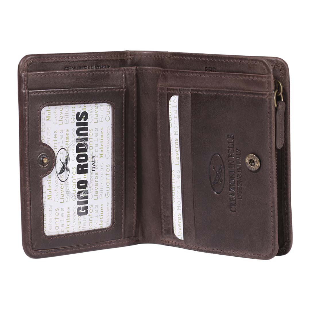- Billetera vertical con cierre de broche de presión y monedero exterior con cierre de cremallera.