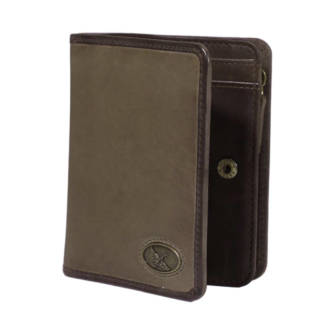 - Billetera vertical con cierre de broche de presión y monedero exterior con cierre de cremallera.