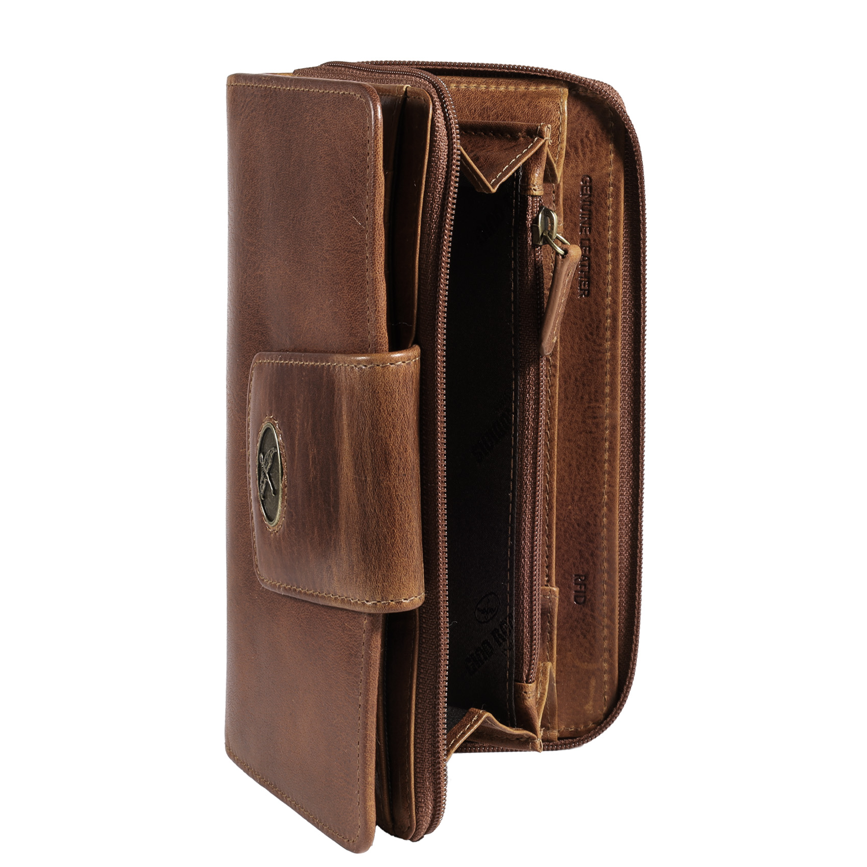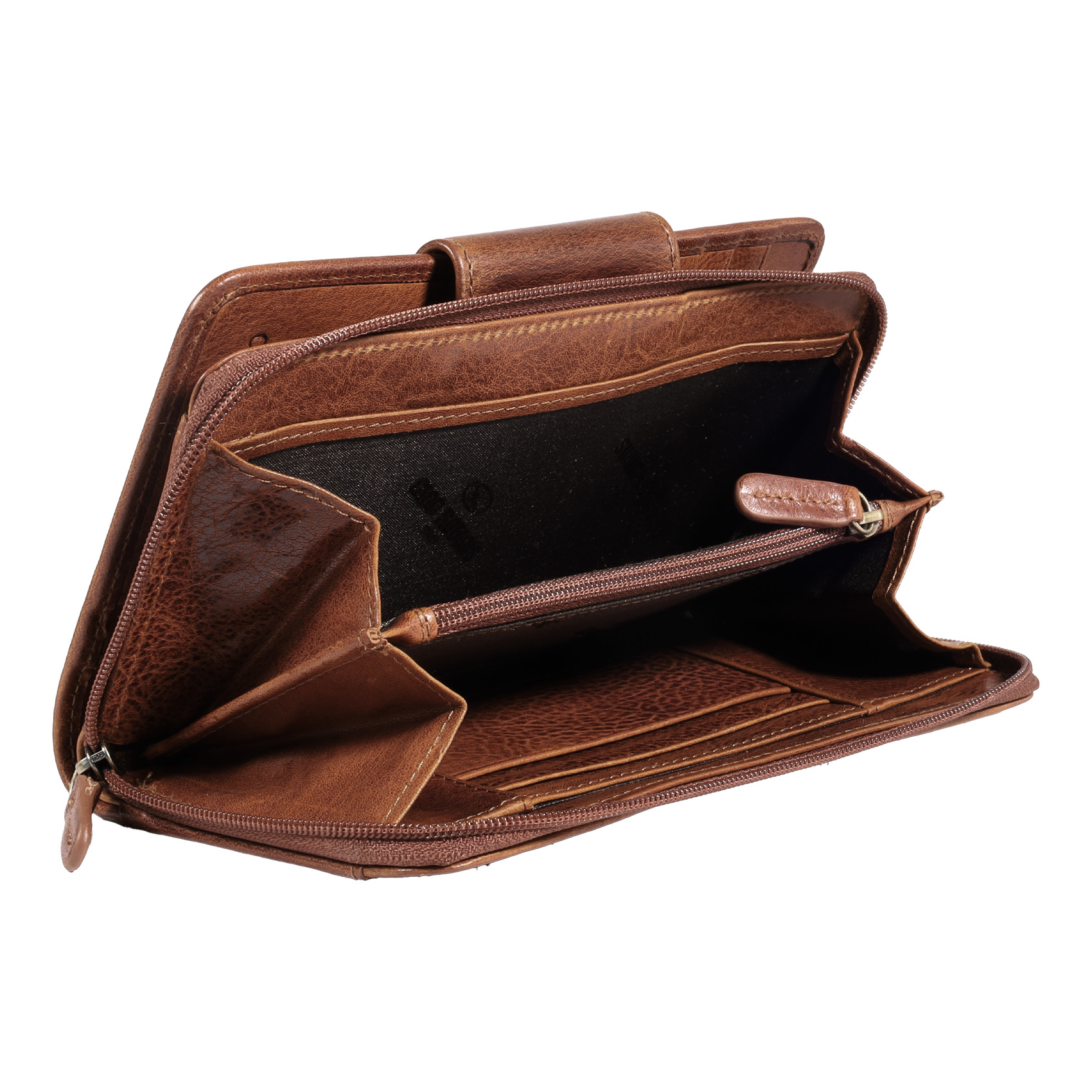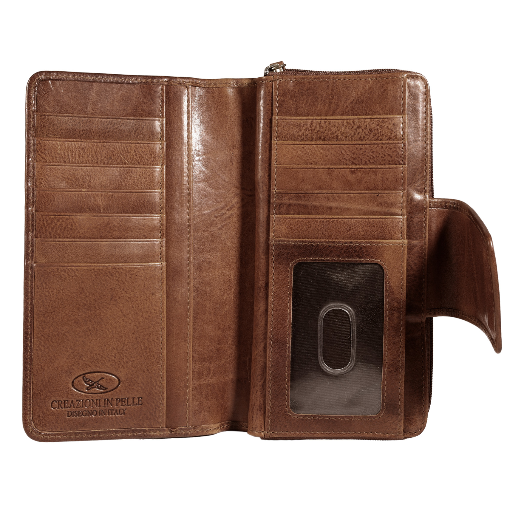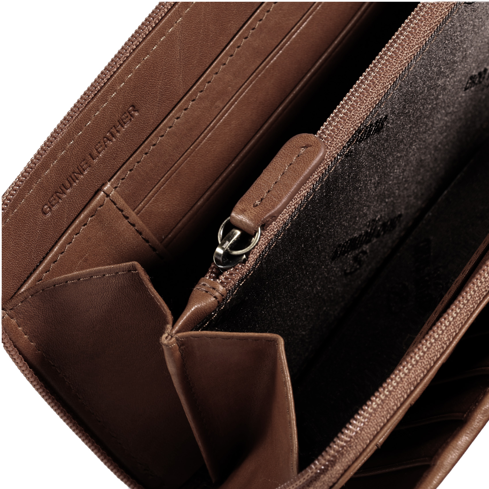 - Billetera dividida en dos zonas, una con cierre de cremallera y otra con broche imantado