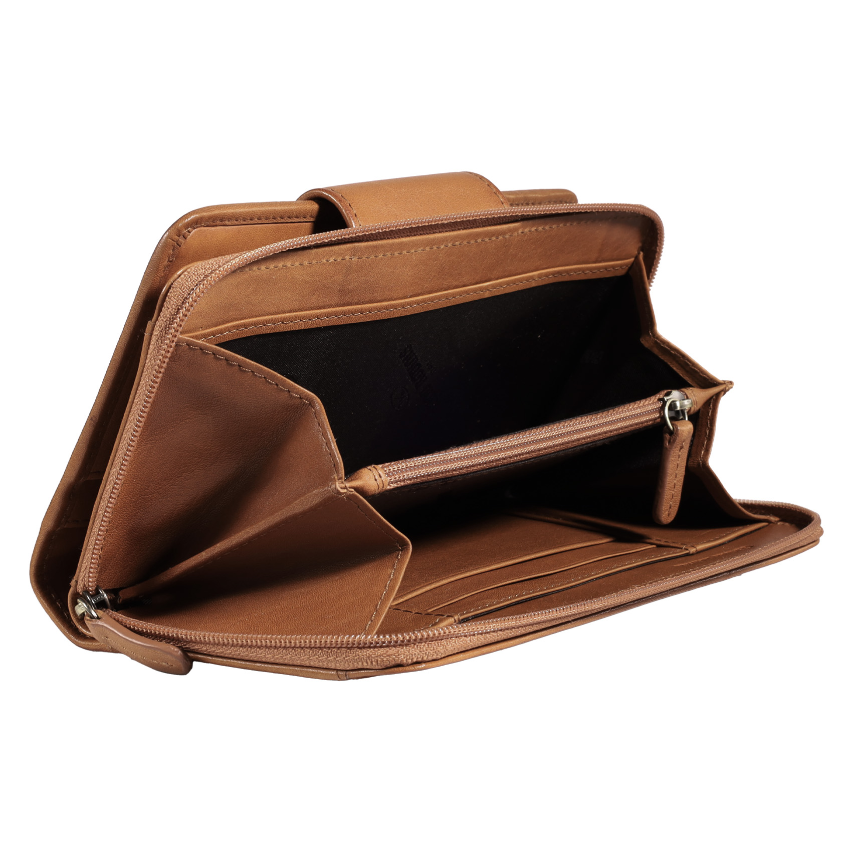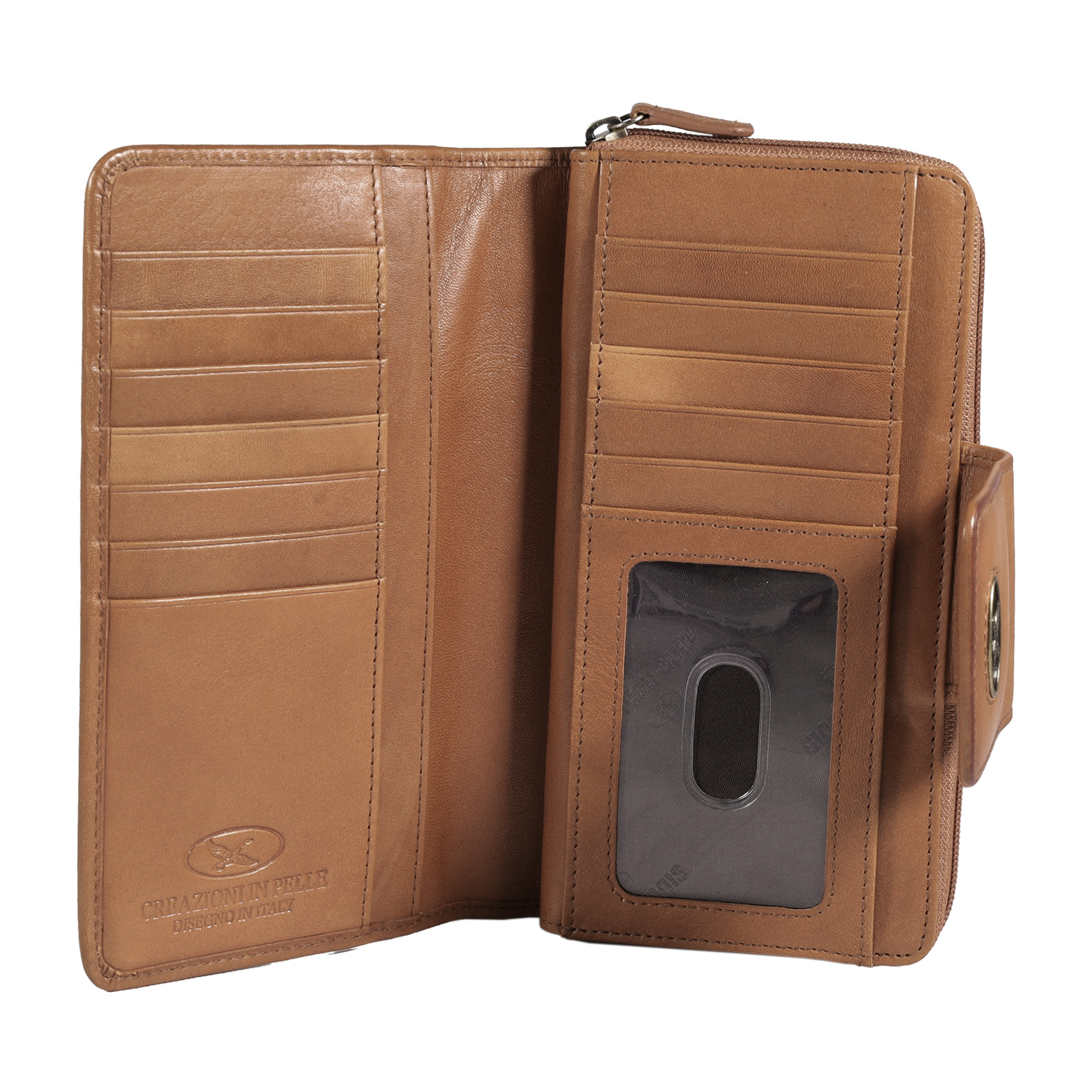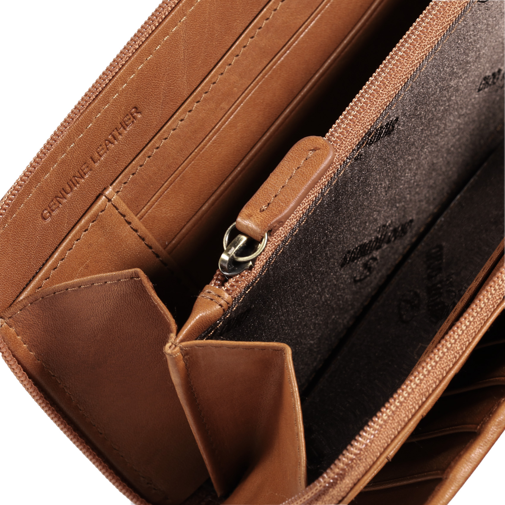 - Billetera dividida en dos zonas, una con cierre de cremallera y otra con broche imantado