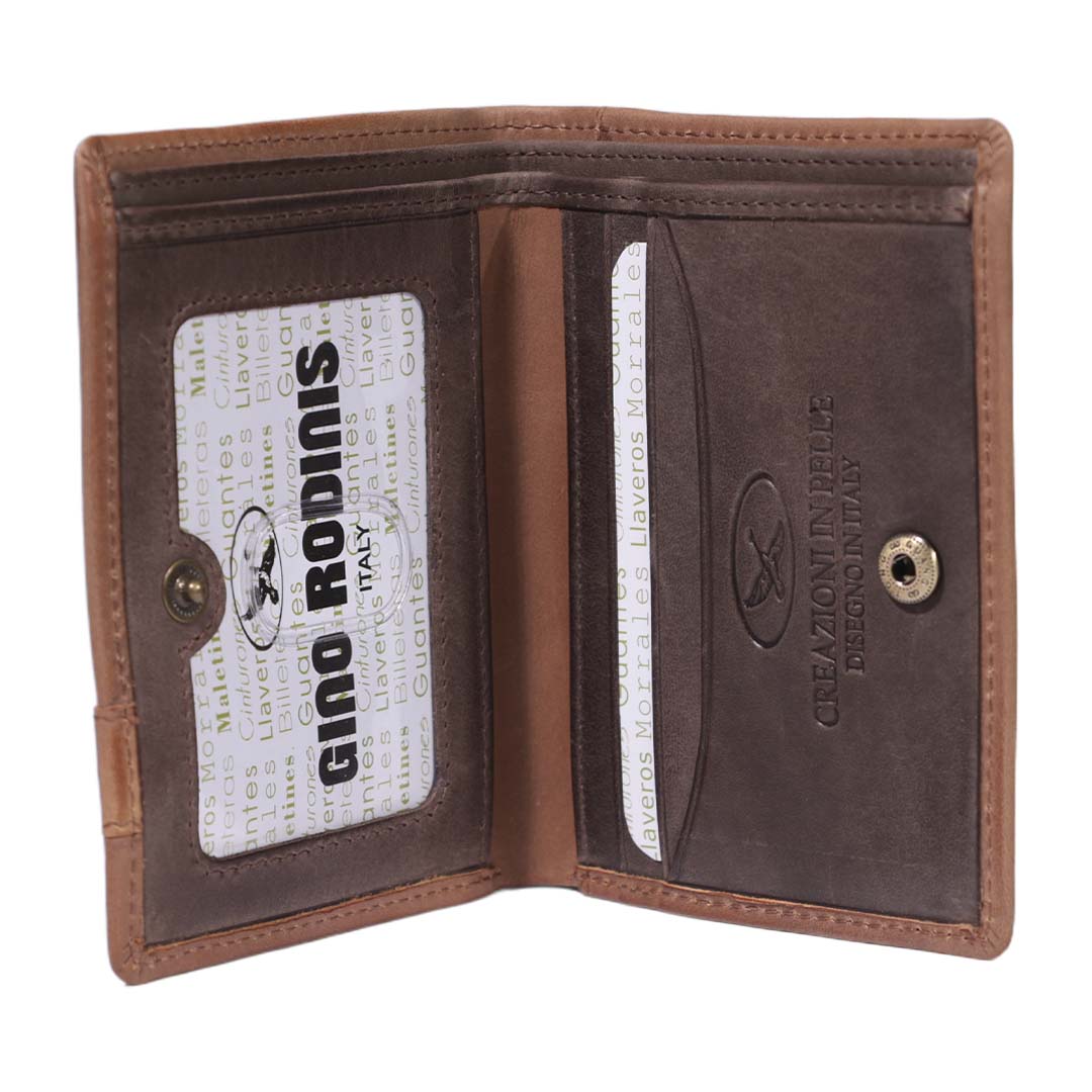 BILLETERA DE CUERO VERTICAL, CON BROCHE DE PRESIÓN Y MICA PORTAFOTOS
