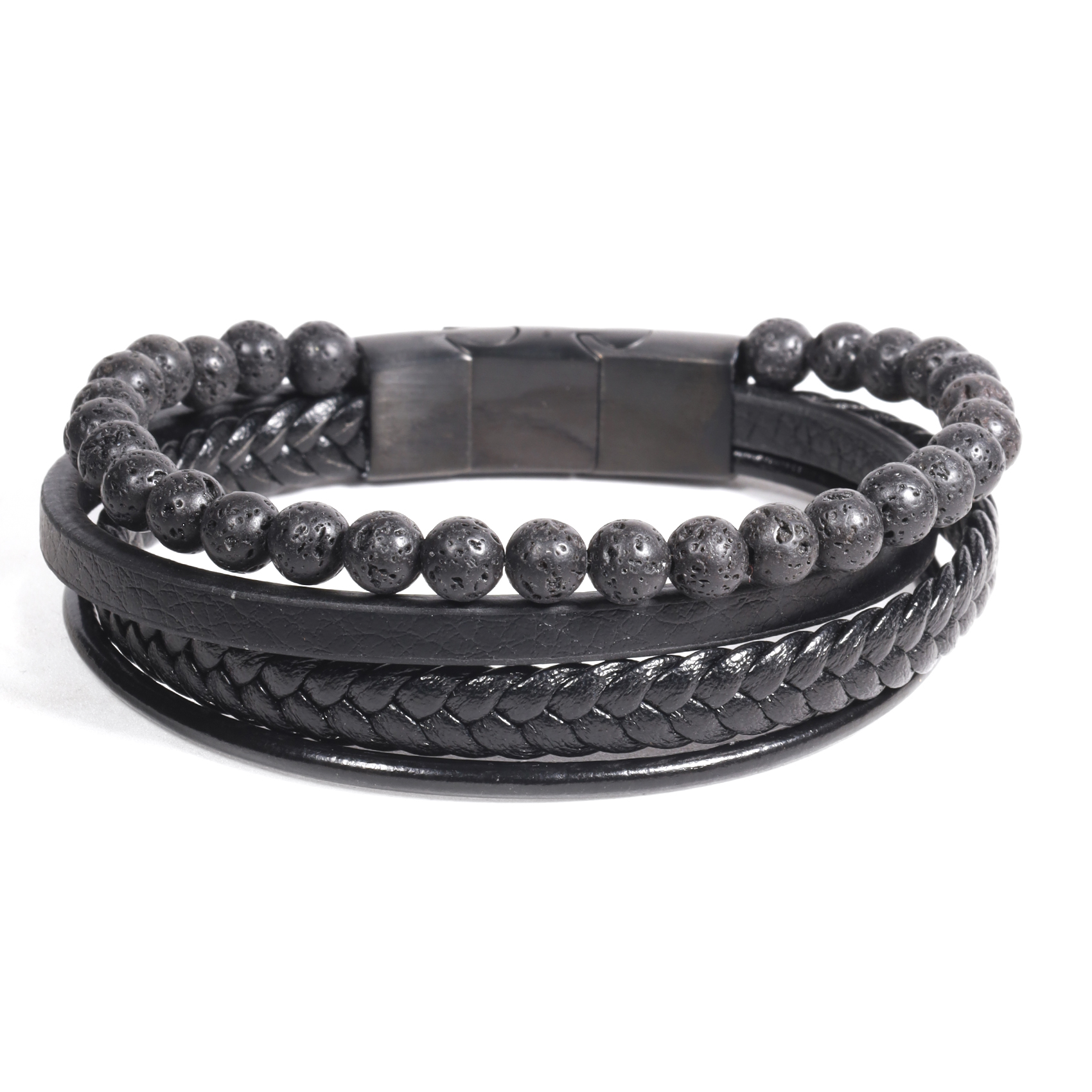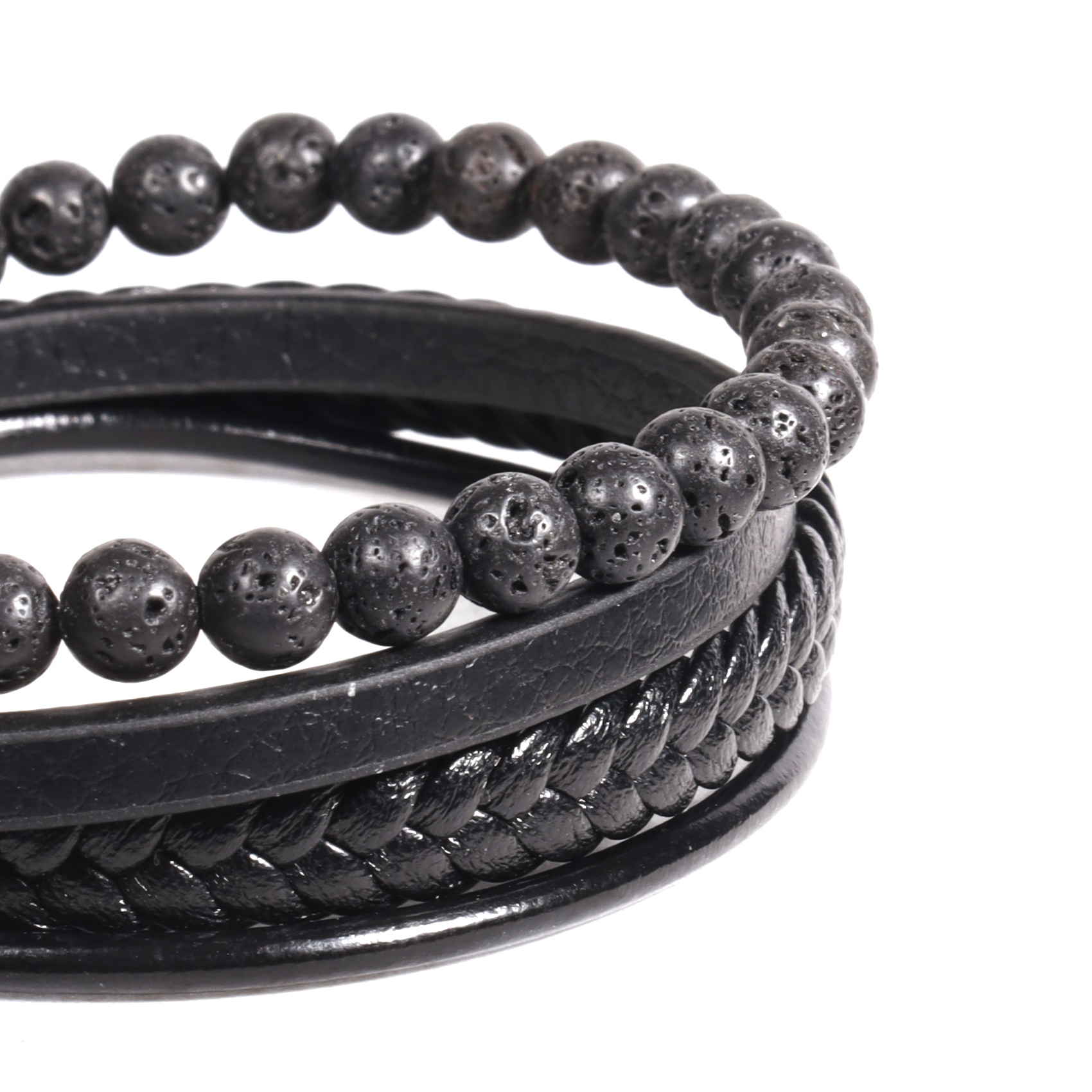 BRAZALETE DE CUATRO PIEZAS, ECO-CUERO TRENZADO, TUBULAR Y LISO CON CIERRE METÁLICO