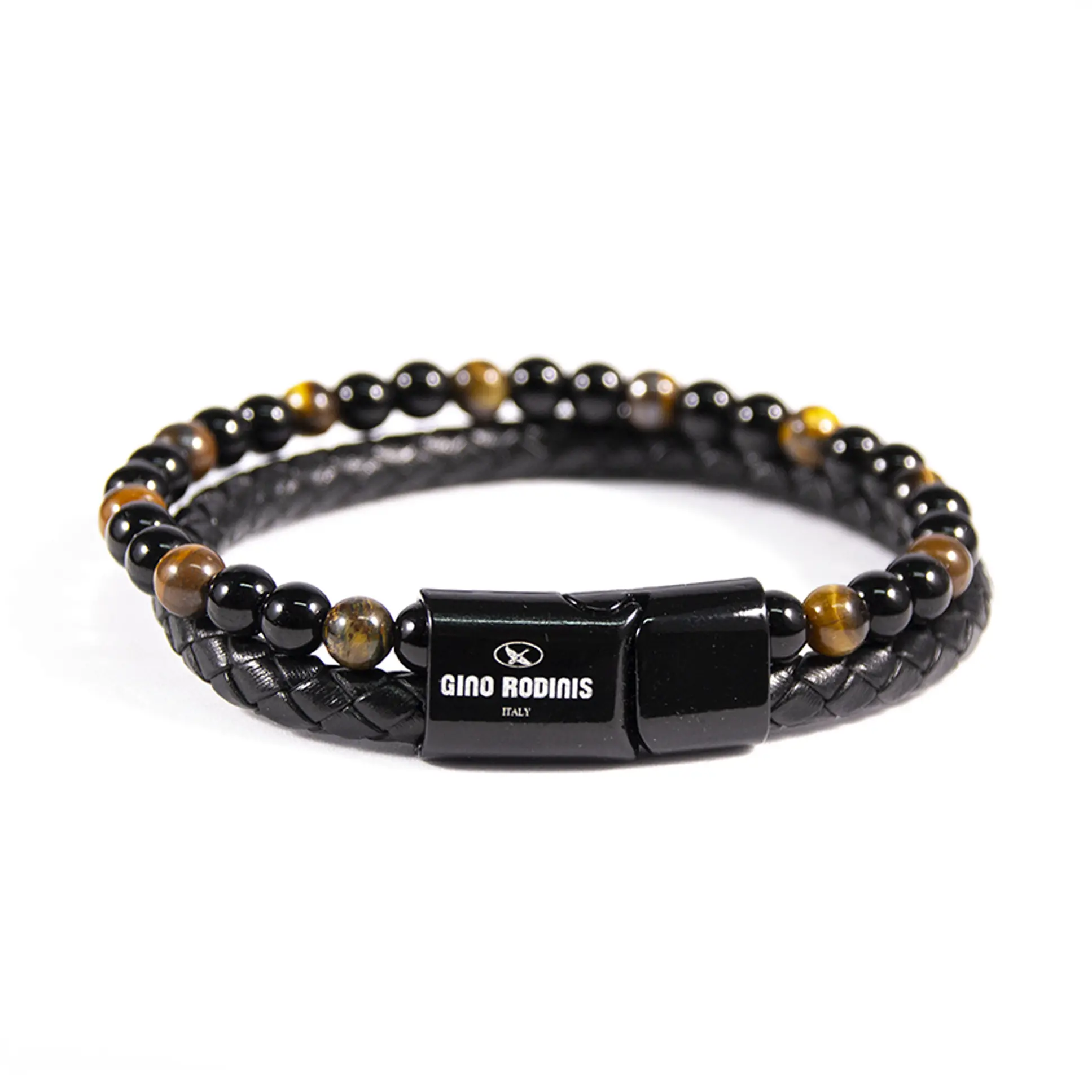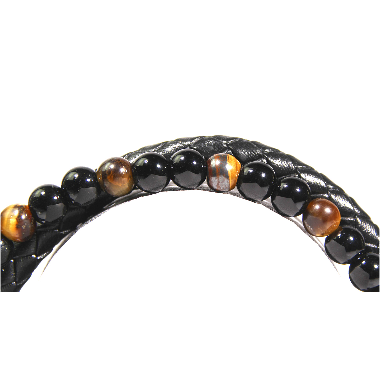 - Un brazalete tubular de cuero trenzado + un “aro” de pequeñas esferas en dos tonos