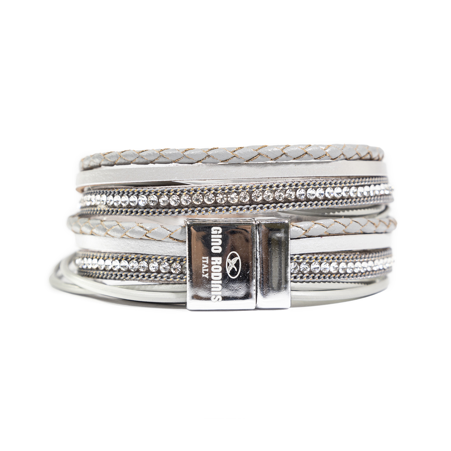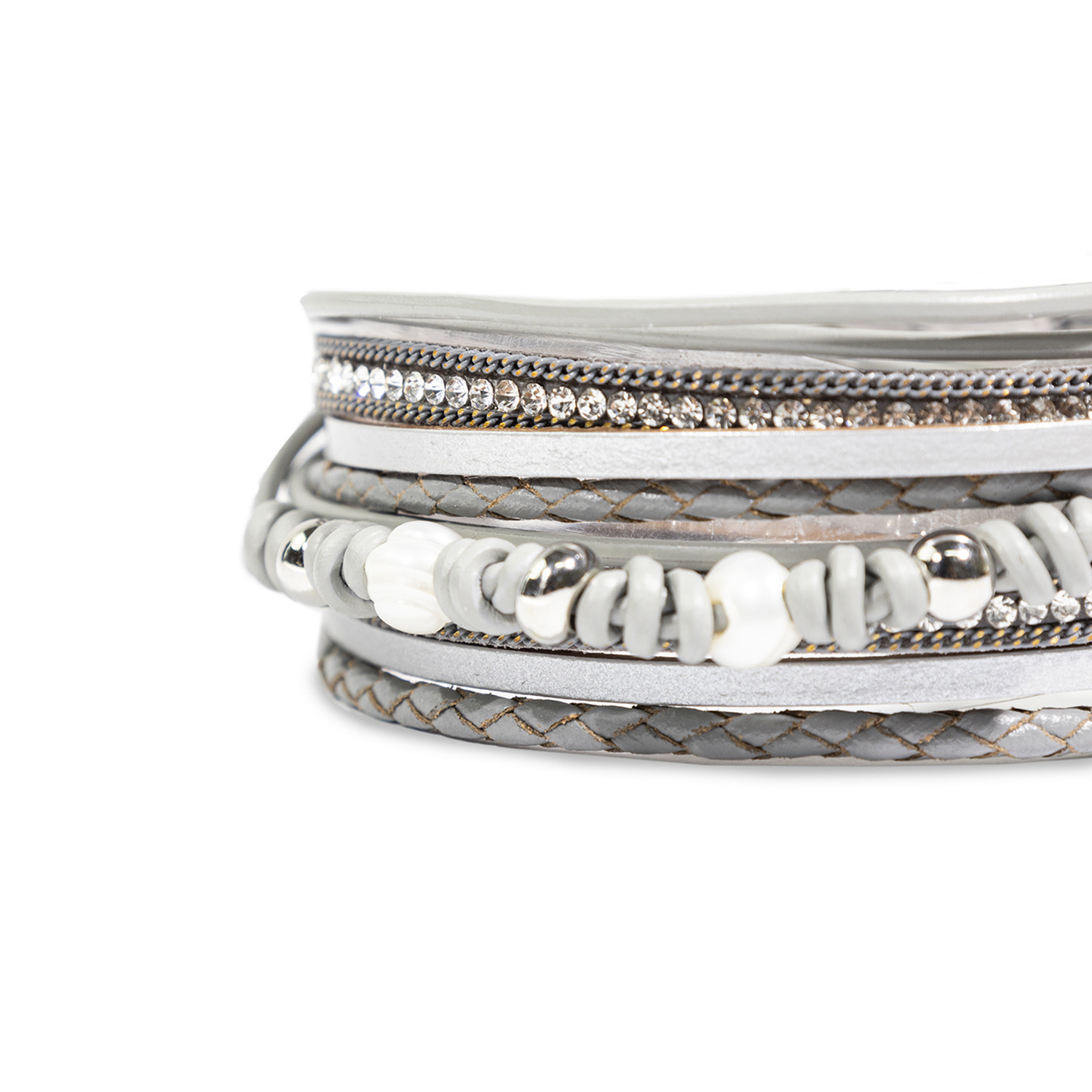 - Brazalete de dos vueltas compuesto de 5 cintas de diferentes formas, texturas y brillos