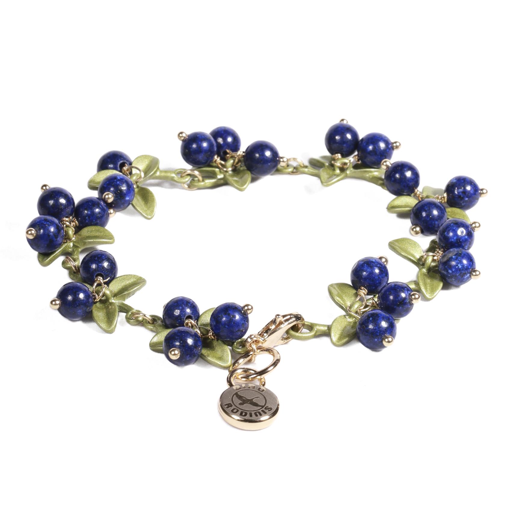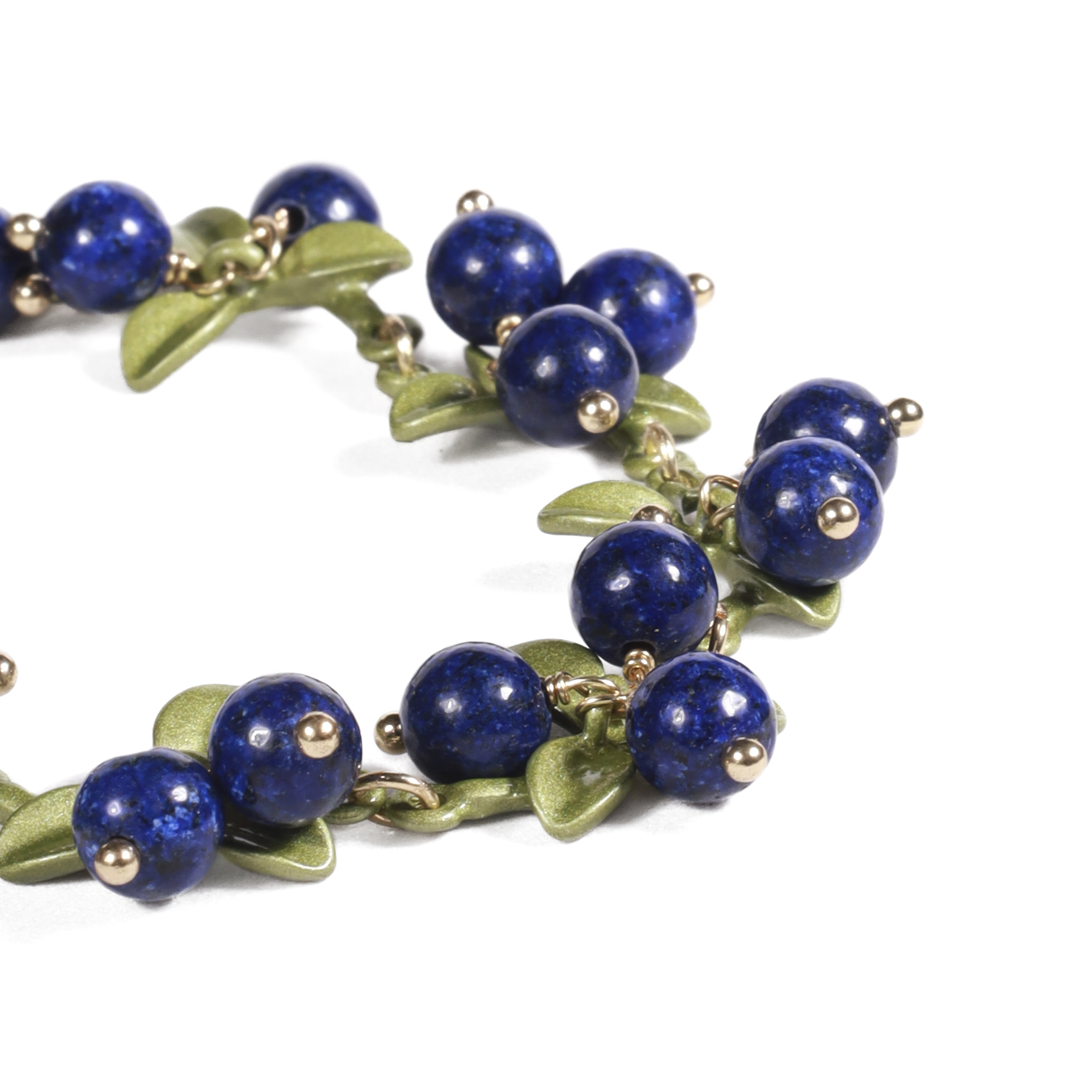 - Brazalete con diseño de cadena que simula pequeños arándanos brillantes, acompañado de delicadas hojas verdes