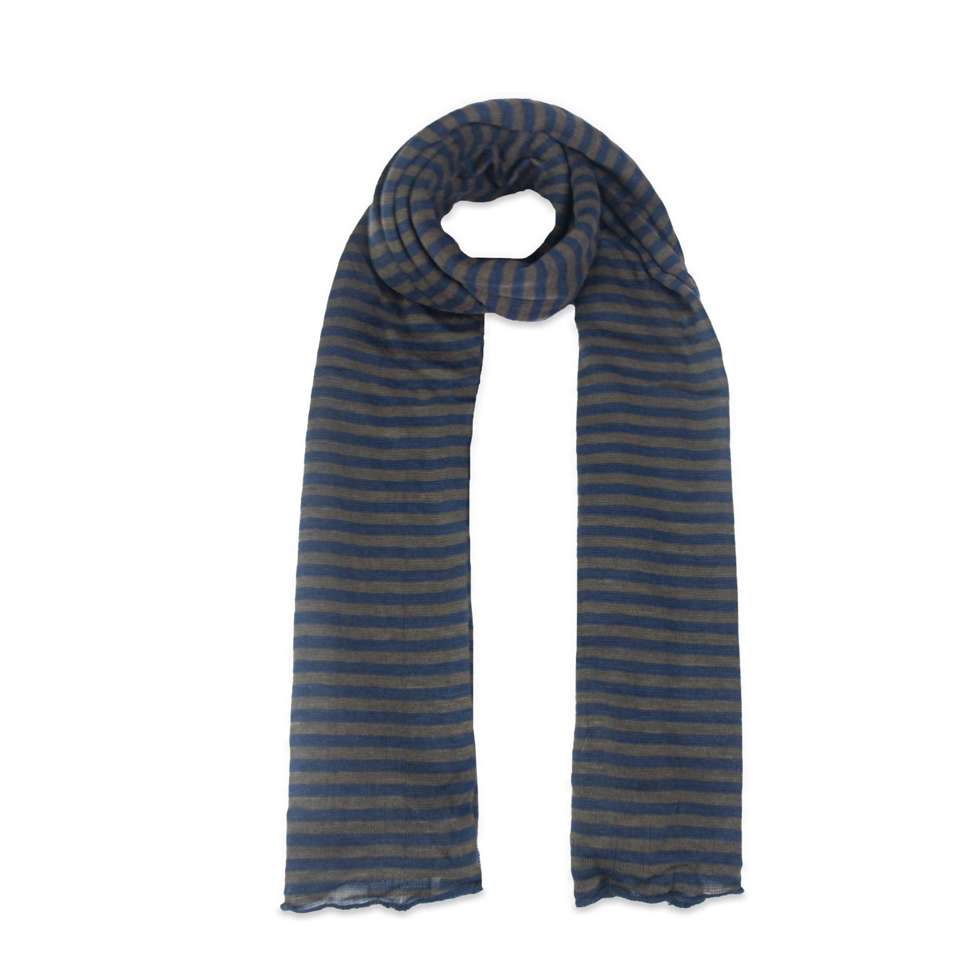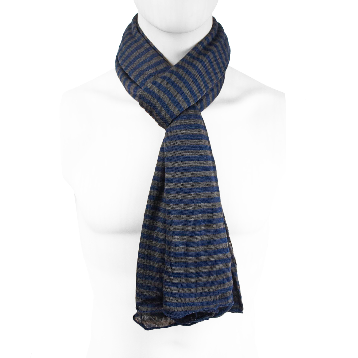 BUFANDA 100% EN ACRÍLICO DE TEJIDO DELGADO CON DISEÑO A RAYAS EN TONOS AZUL Y CAFÉ UN COMPLEMENTO VERSÁTIL QUE APORTA ESTILO EN TU DÍA A DÍA.