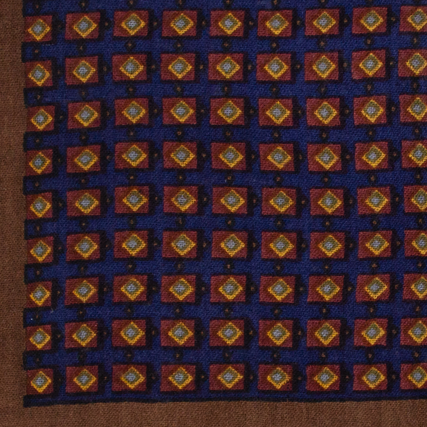 - Tejido delgado con contorno café y centro con mini cuadrados azul y café.