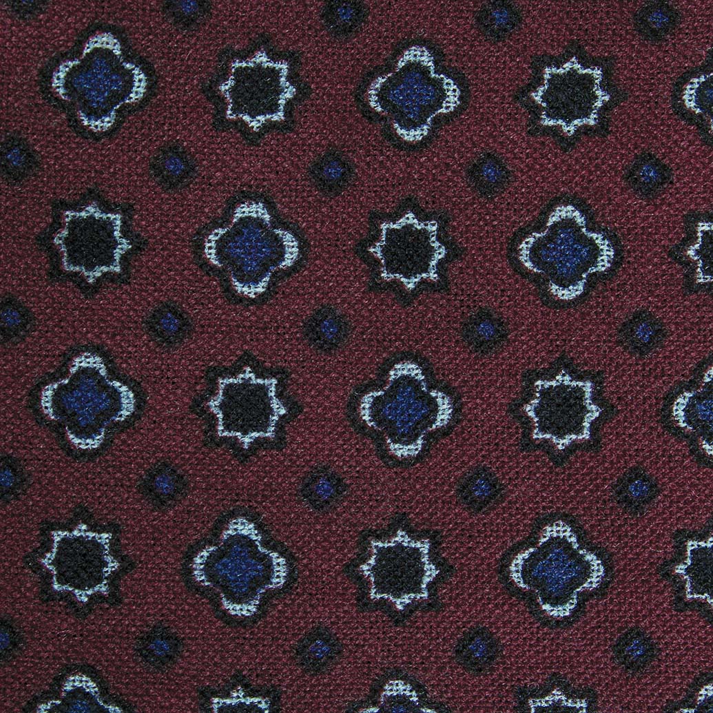 - Tejido con fondo burdeos y pequeñas aplicaciones en tonos azules, grises y negros.