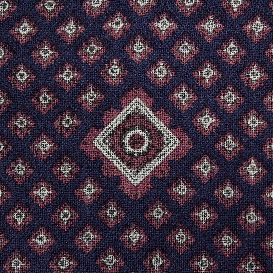 - Tejido de fondo azul oscuro, con motivos en tonos crudos y palo de rosa.