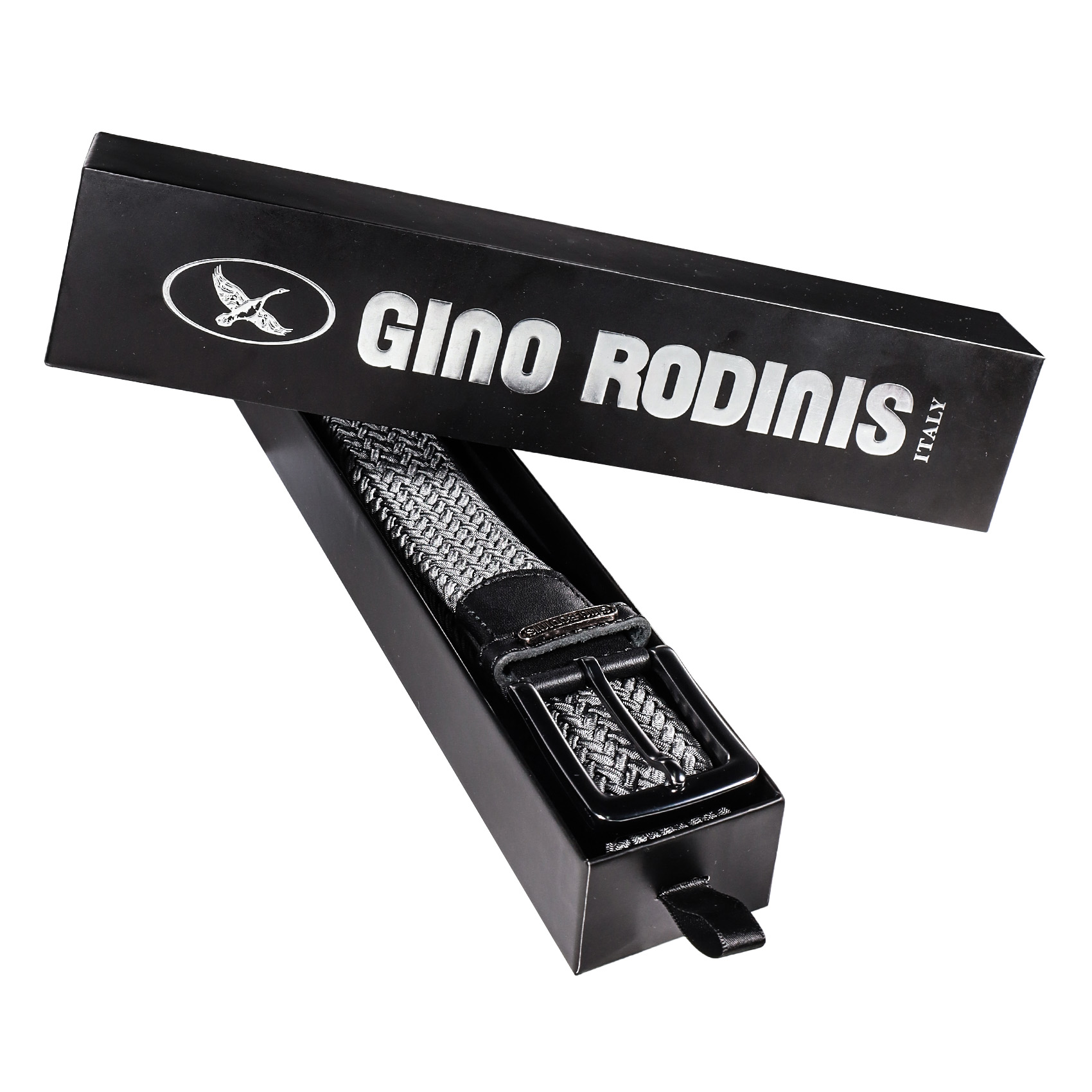 - Un pasador de cuero con una placa metálica con el logo Gino Rodinis