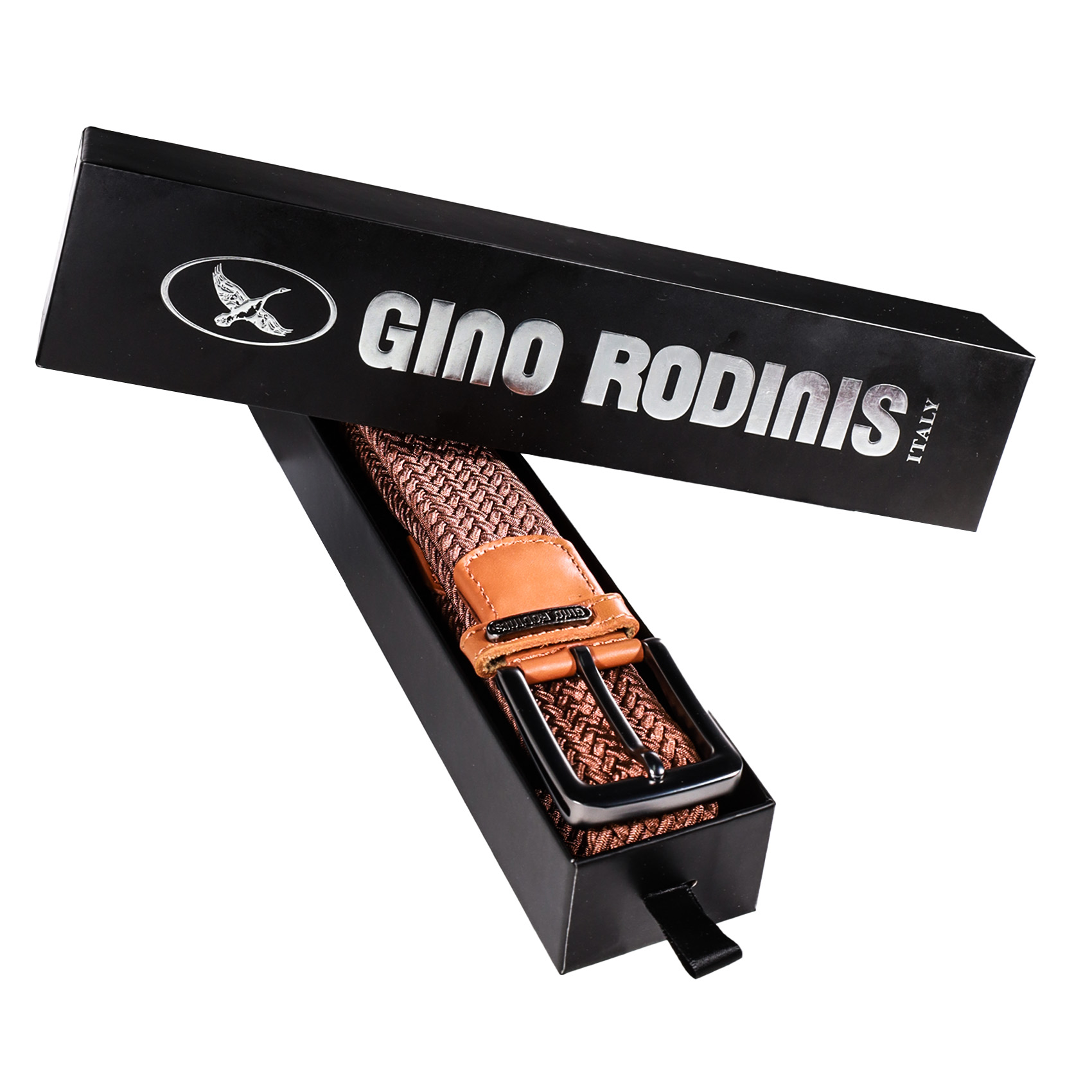 - Un pasador de cuero con una placa metálica con el logo Gino Rodinis