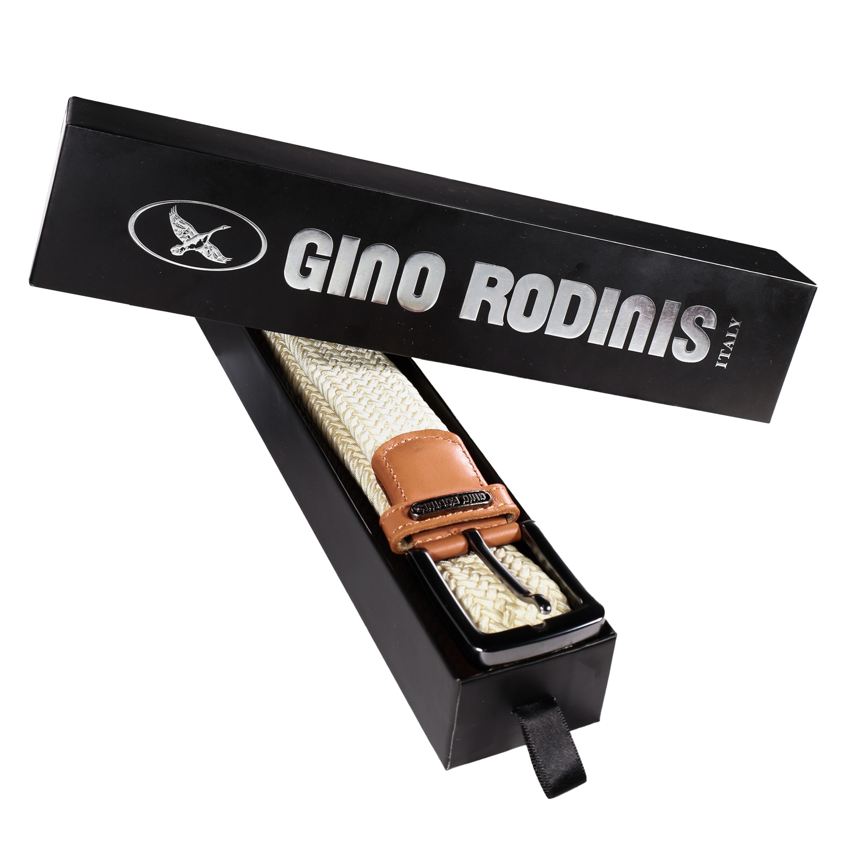 - Un pasador de cuero con una placa metálica con el logo Gino Rodinis