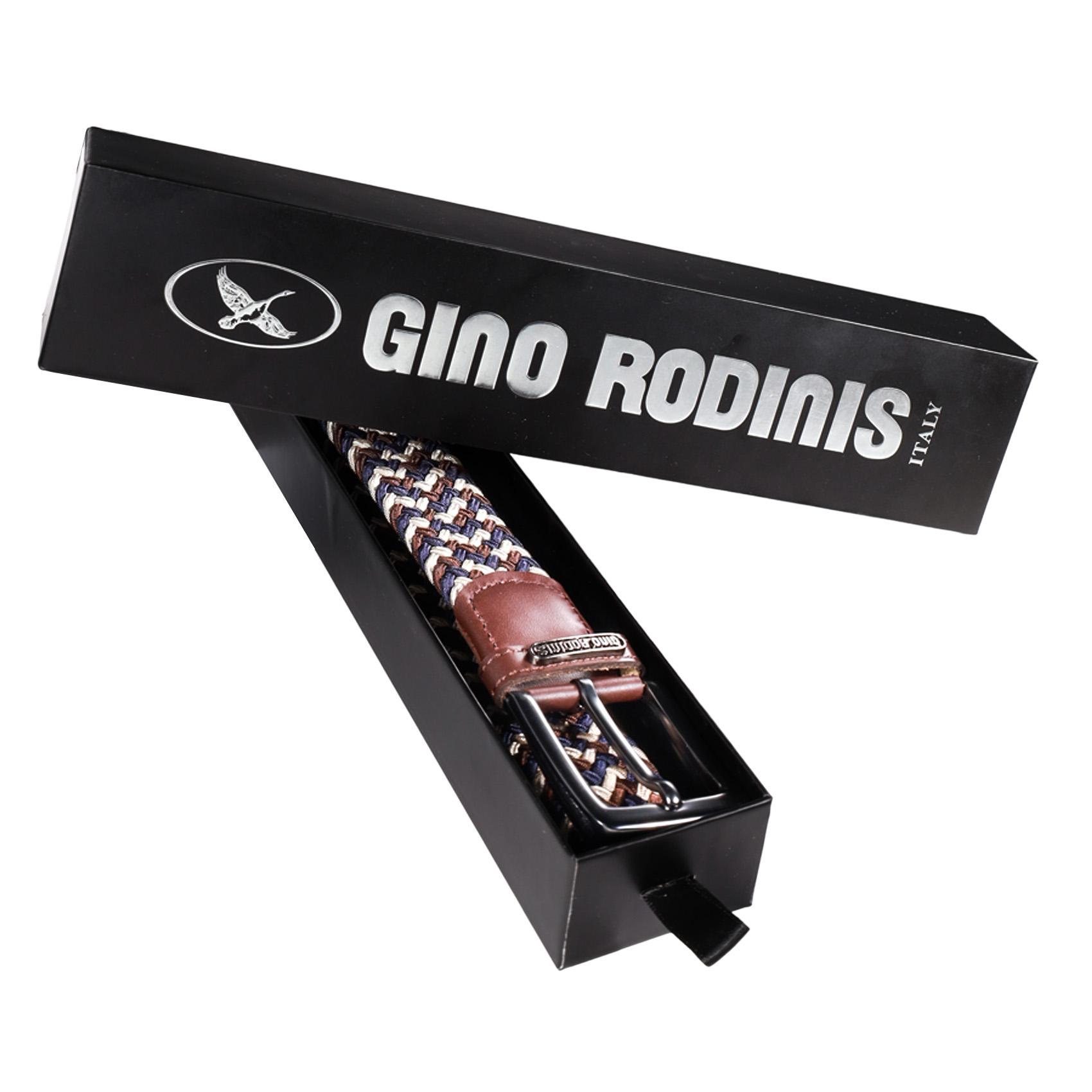 - Un pasador de cuero con una placa metálica con el logo Gino Rodinis