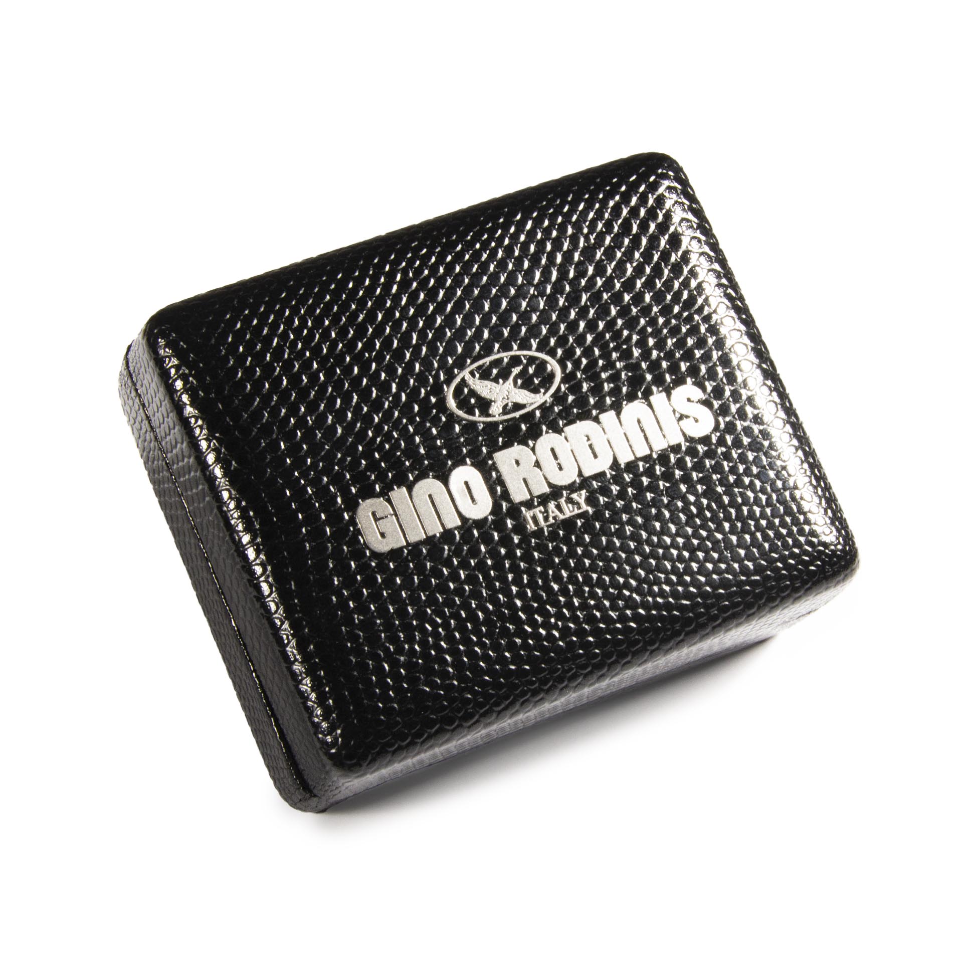 - Cofre recubierto en eco-cuero, símil reptil de color negro, con logo en plata, interior acolchado en terciopelo.