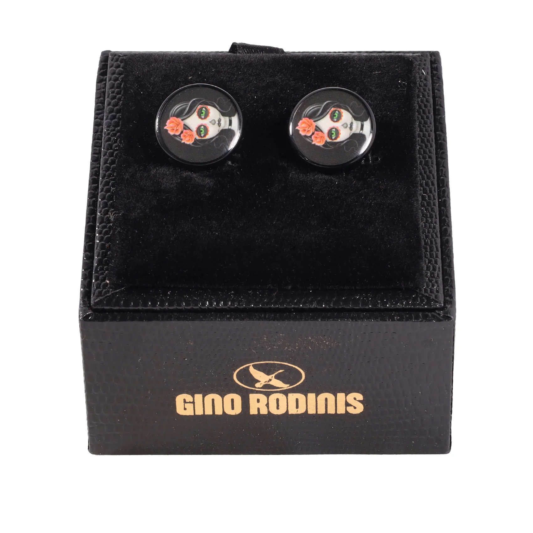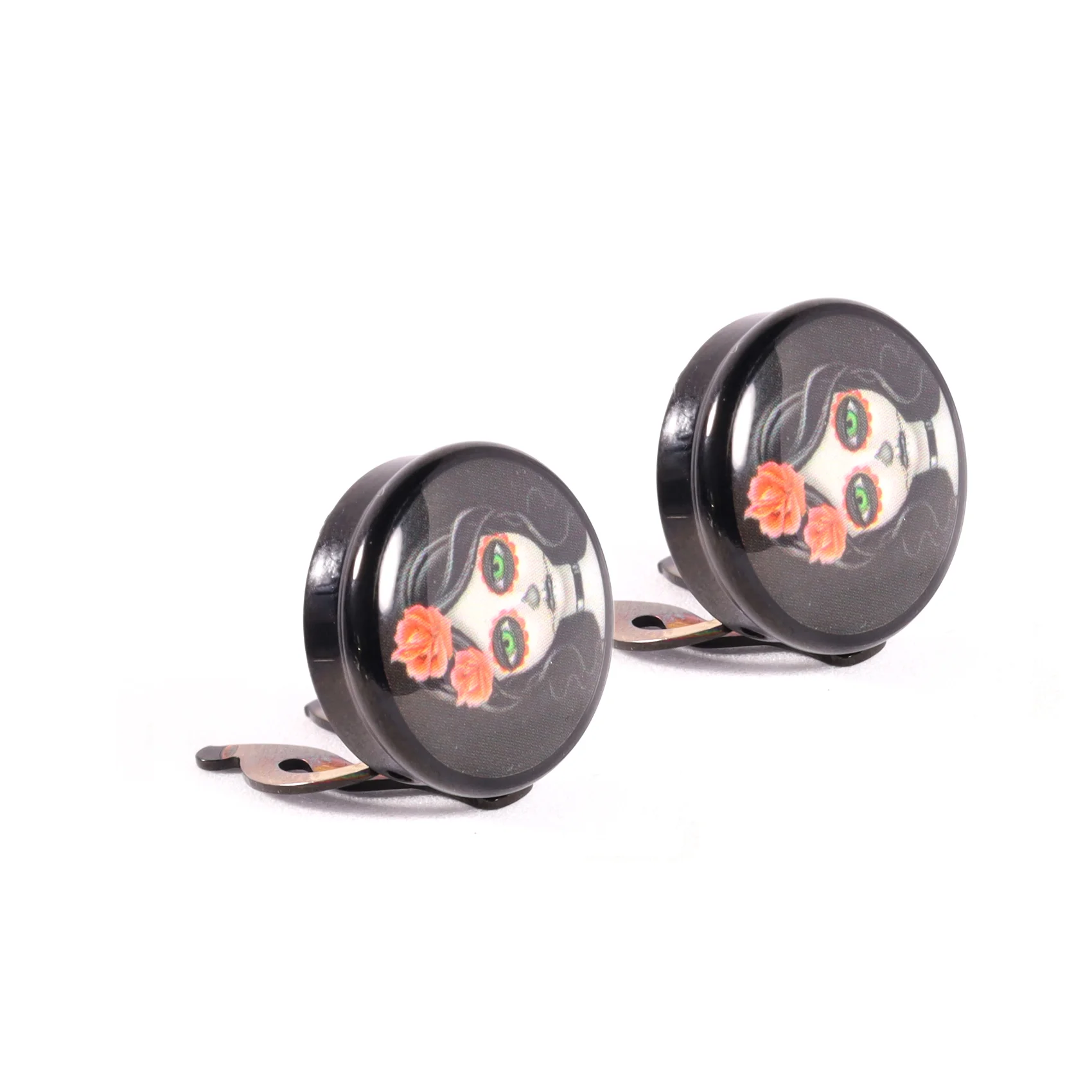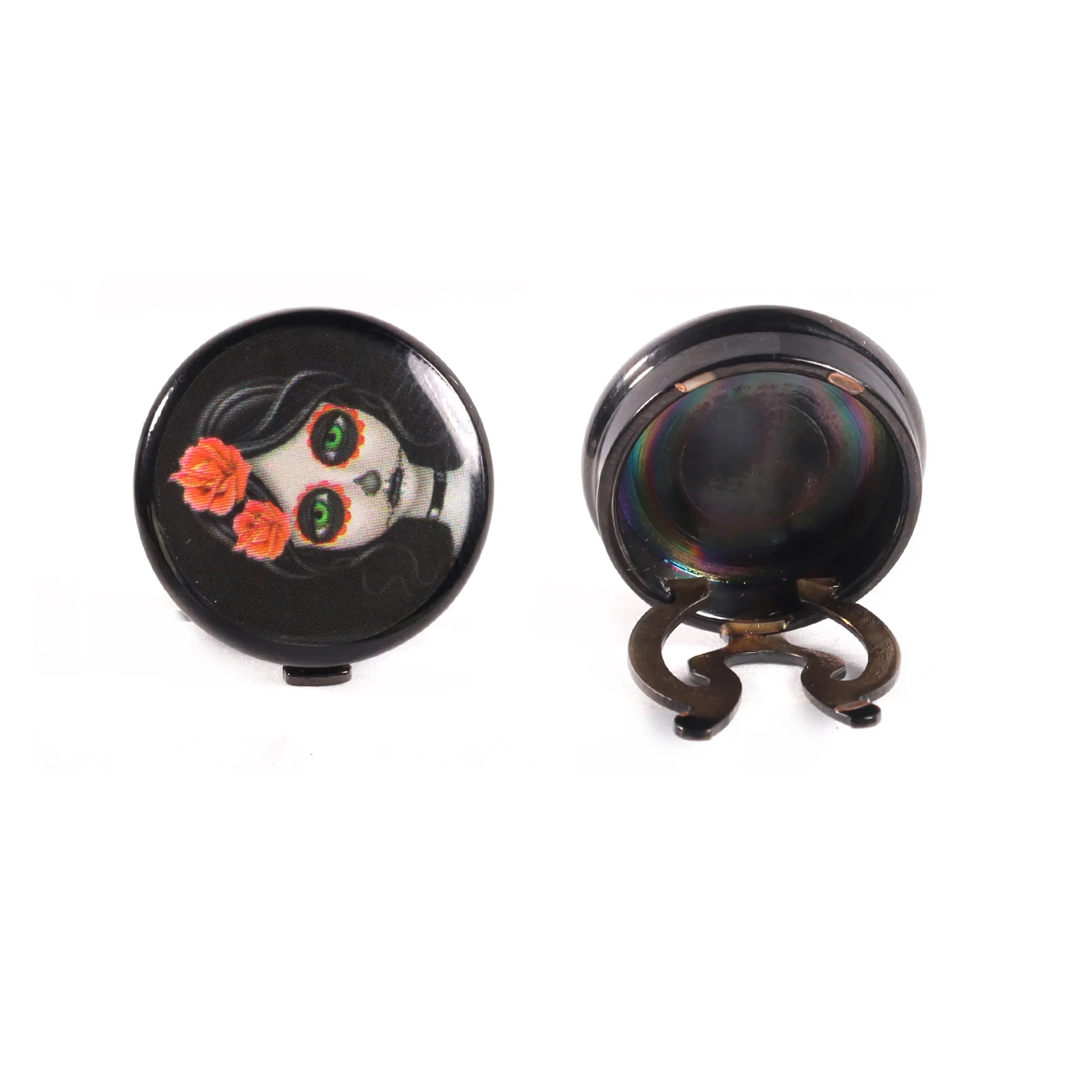 - Piezas redondas, con cubiertas esmaltadas, con catrinas con rosas rojas en su pelo