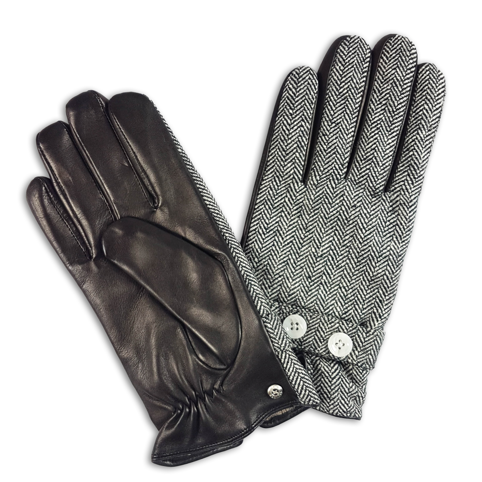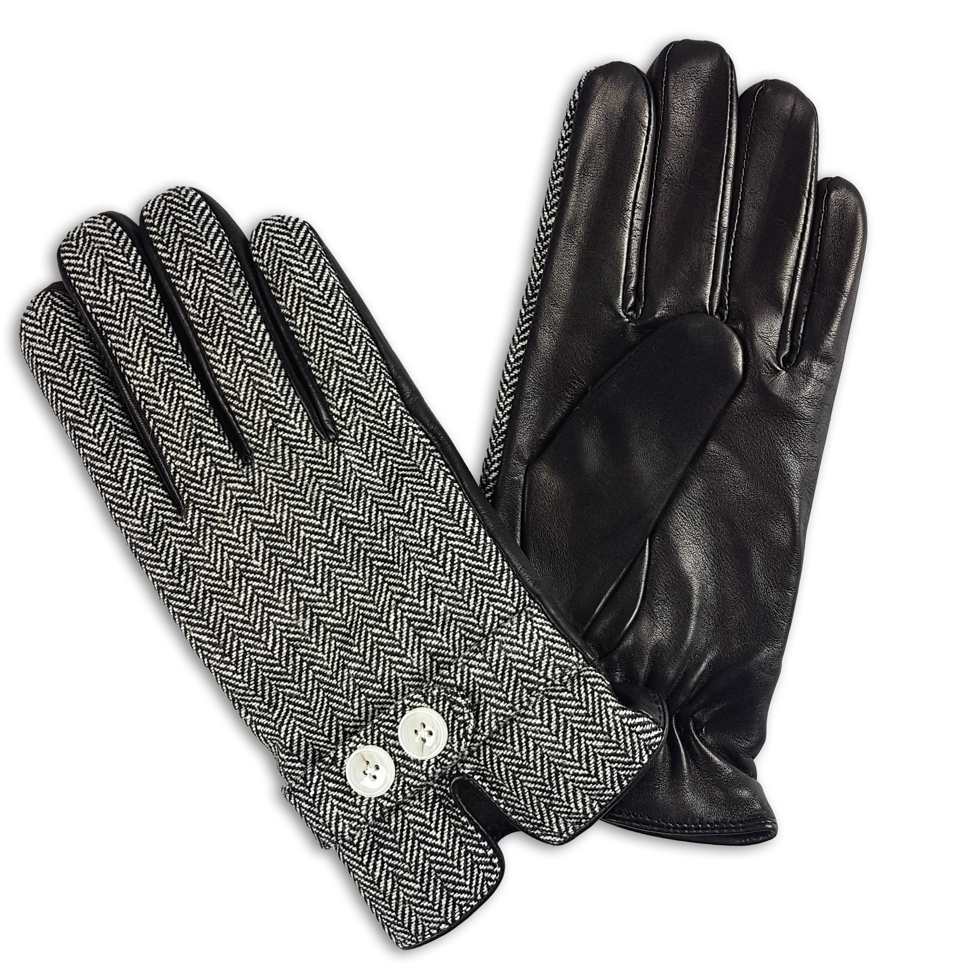 GUANTE CON FORRO DE LANA, PARTE DORSAL DE TELA Y BOTONES DECORATIVOS