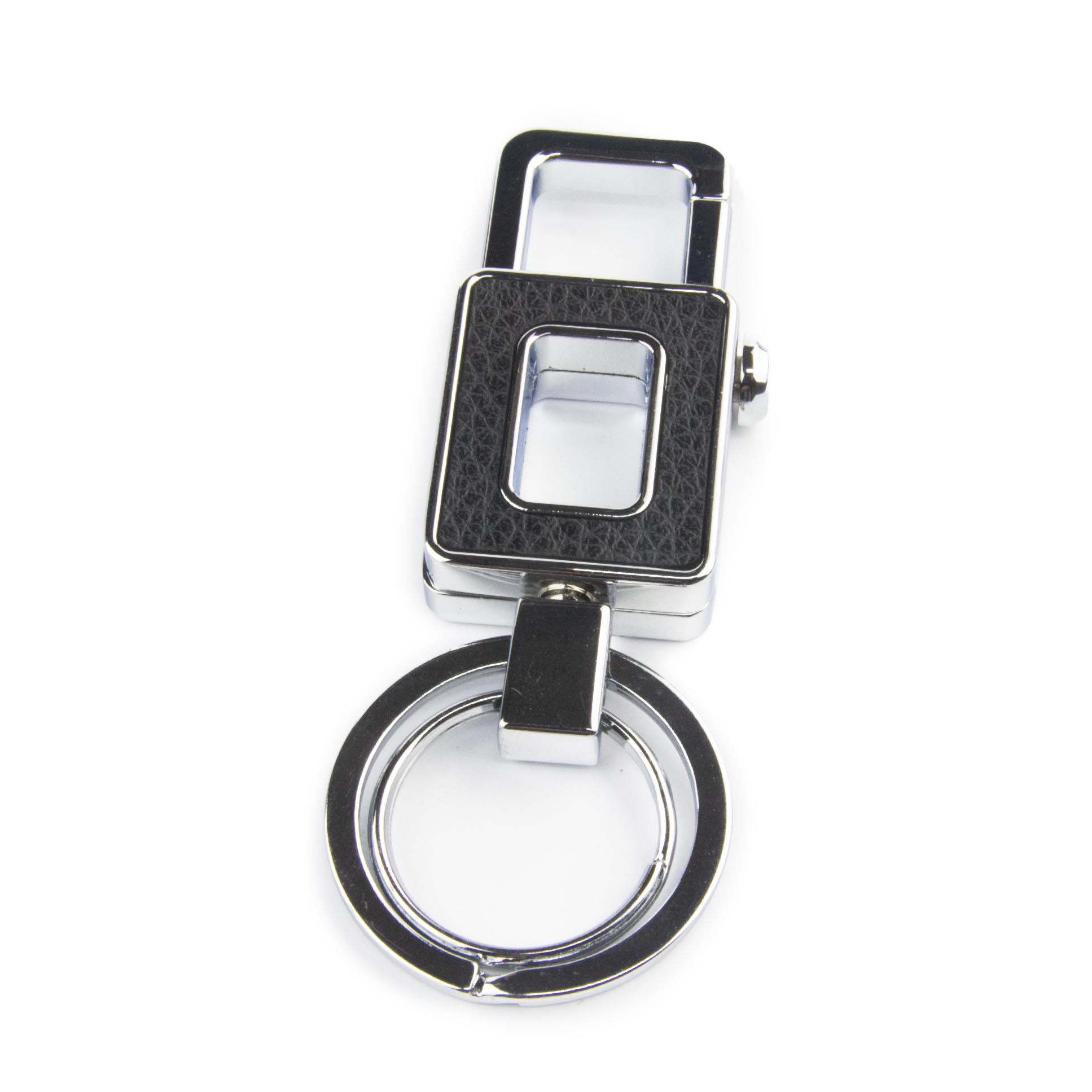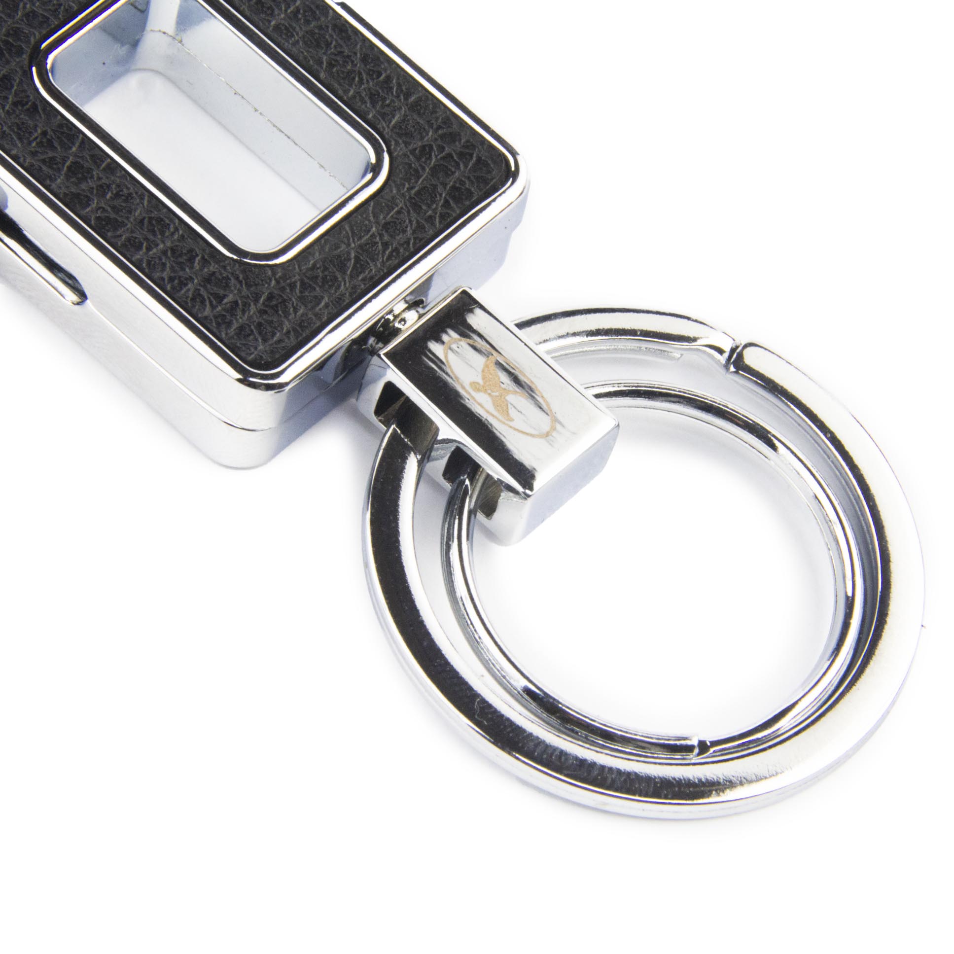 Llavero con mosquetón metálico cuadrado, con resorte y eco cuero, con dos argollas y logo grabado.