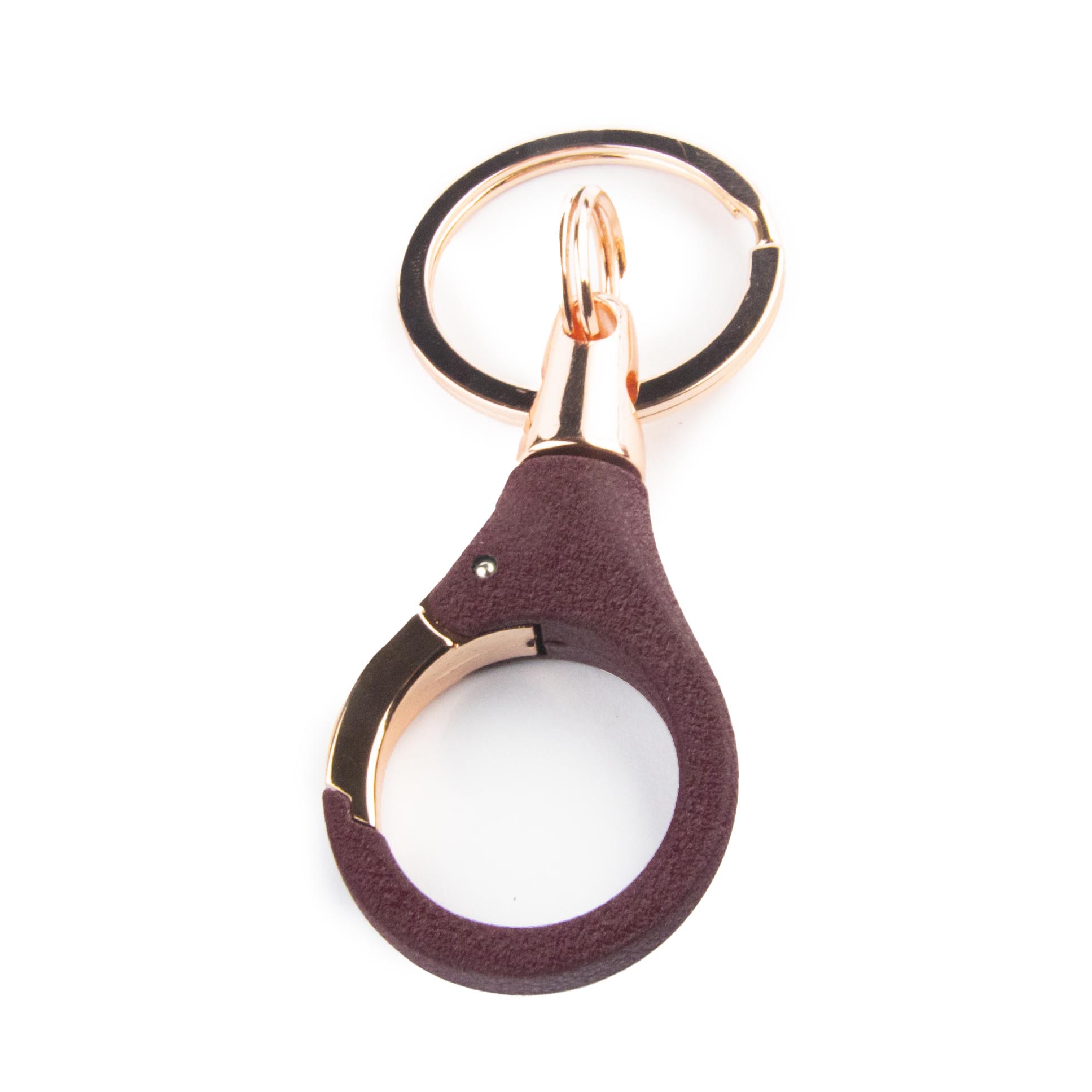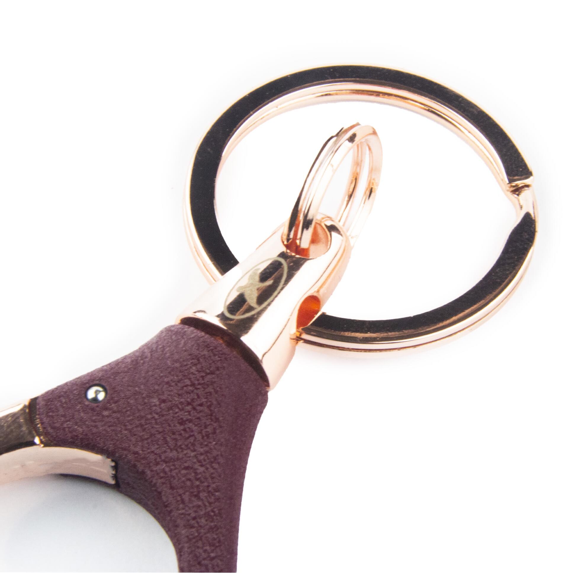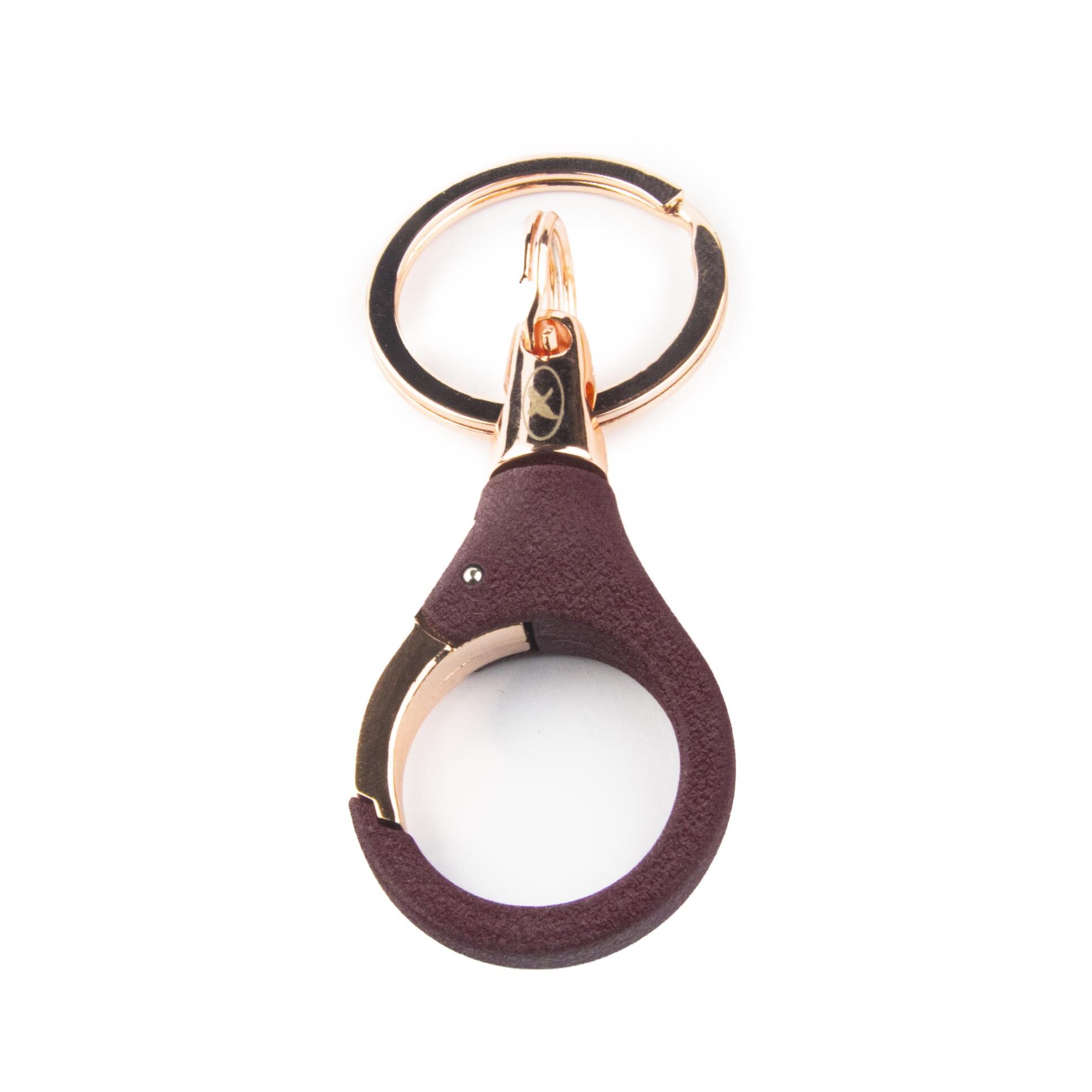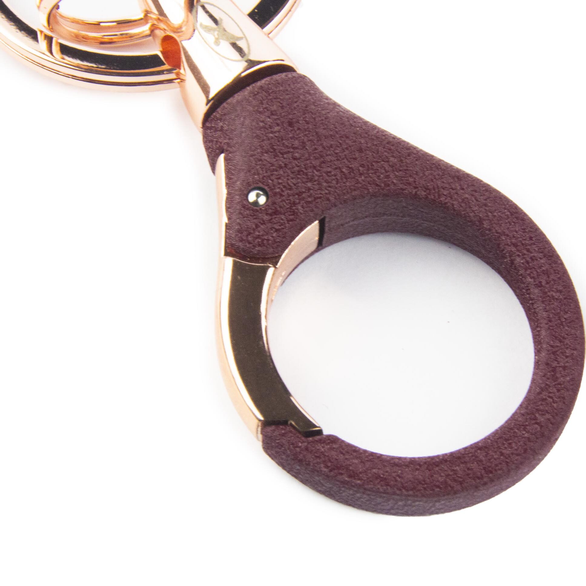- Llavero con mosquetón metálico, resorteado, parcialmente recubierto por un suave garbillado, de color burdeo
