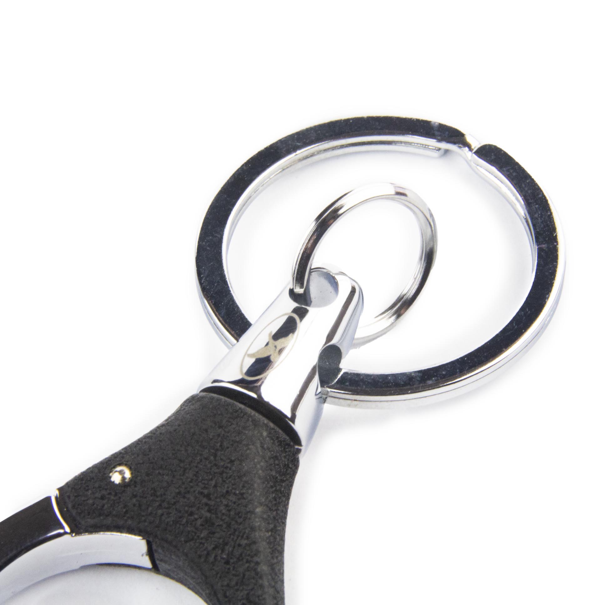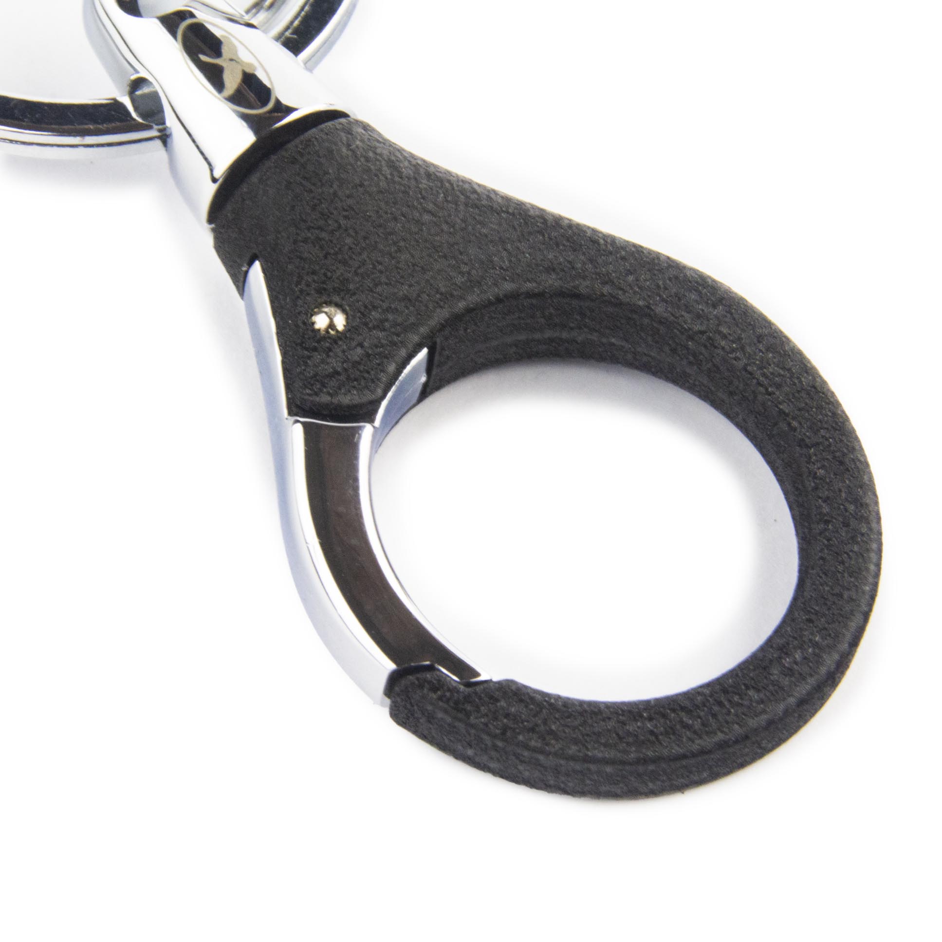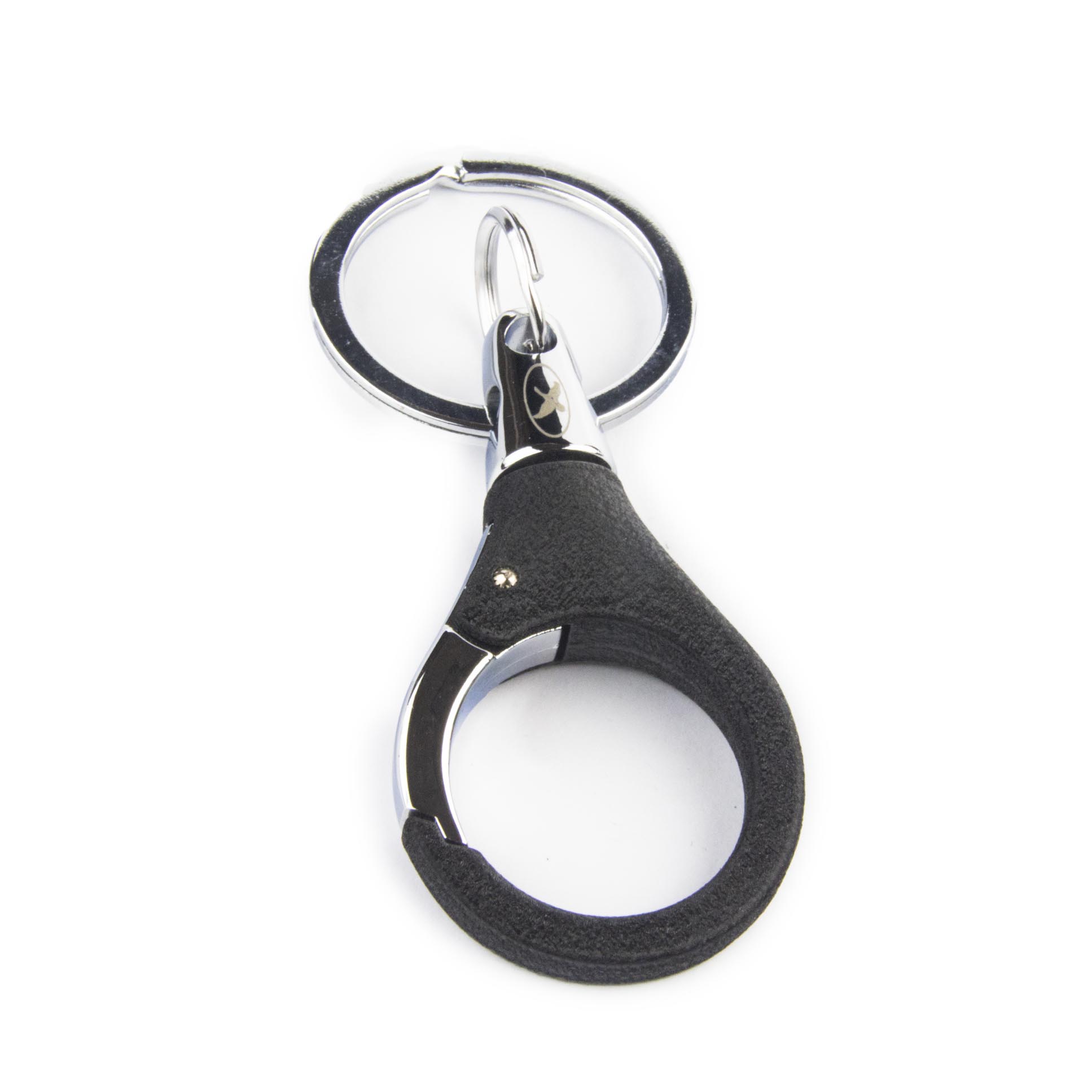 Llavero con mosquetón metálico, con resorte, dos argollas y logo grabado.