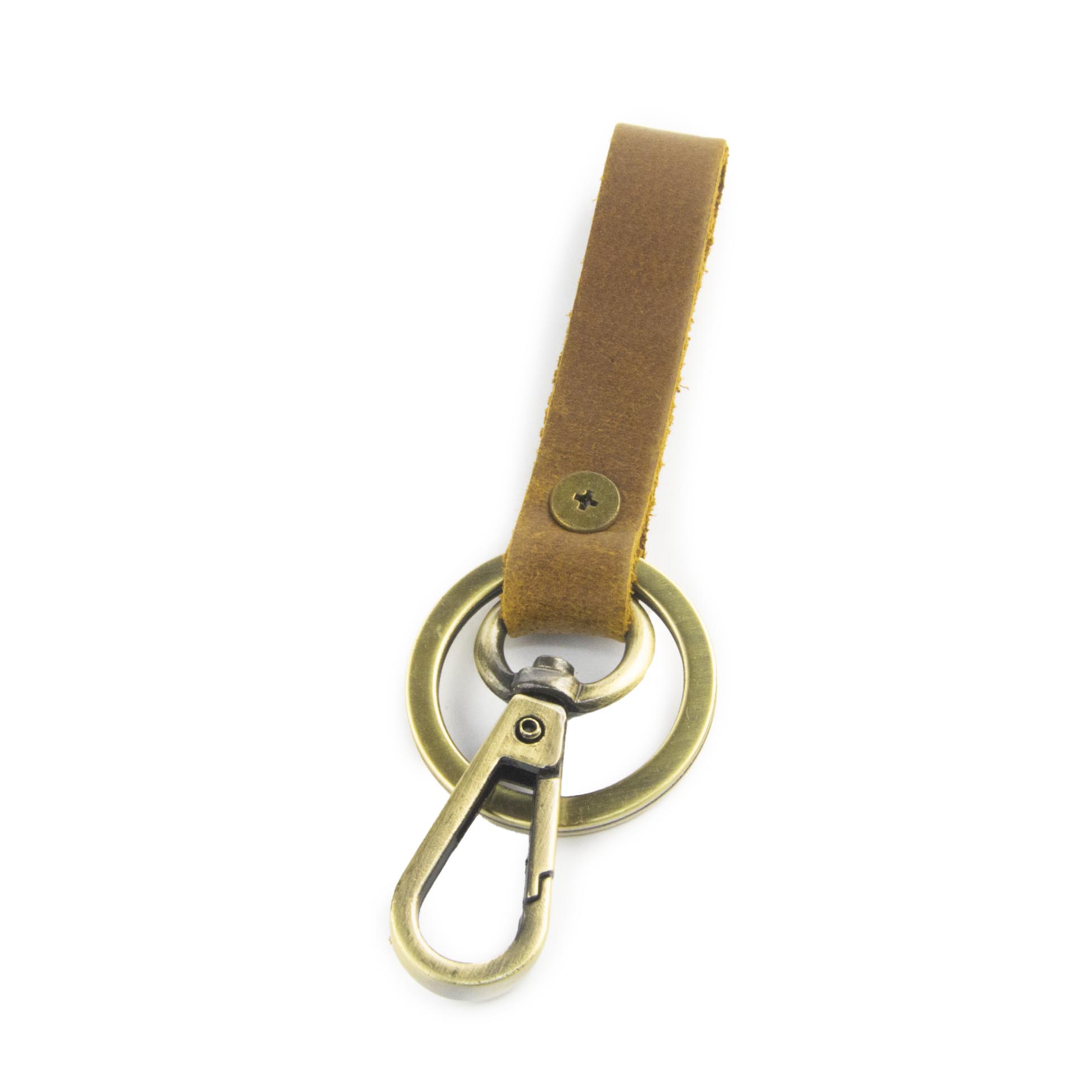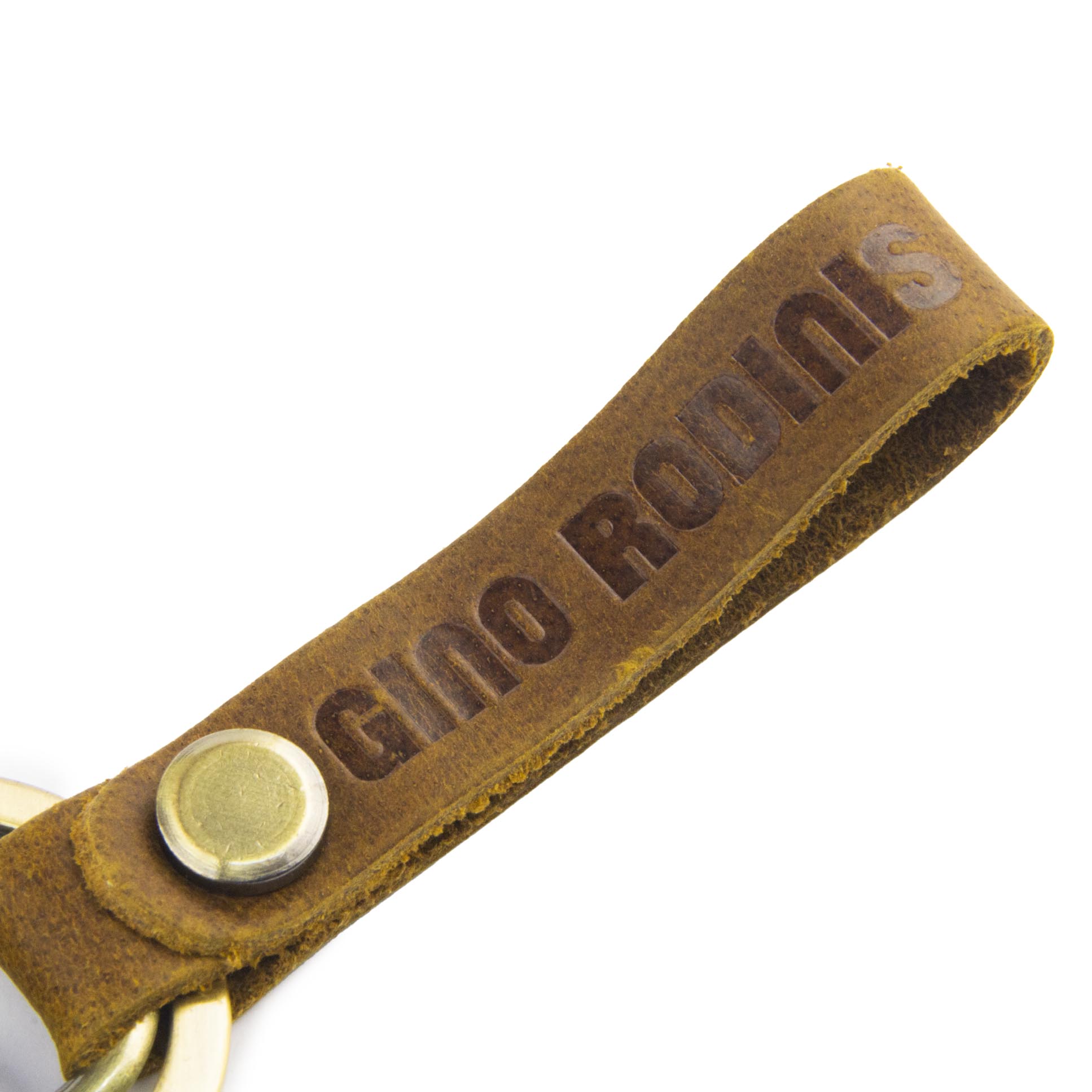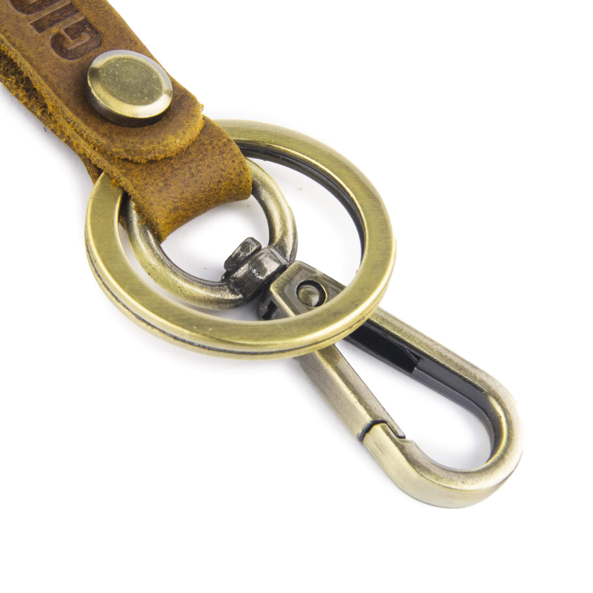 Llavero con mosquetón giratorio, argolla metálica y cinta de cuero con logo.