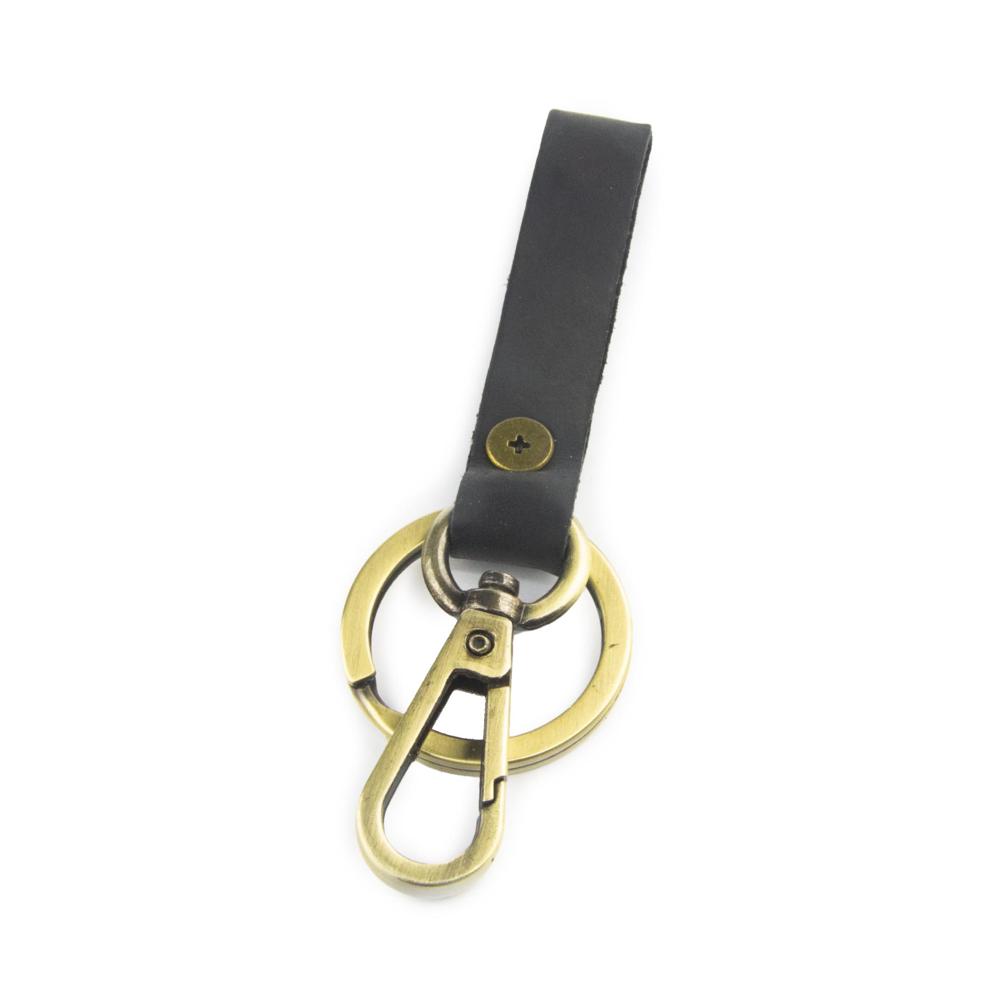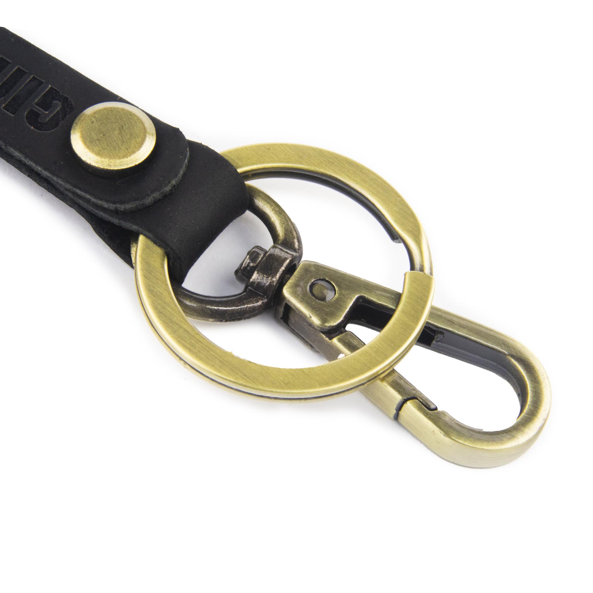 - Una argolla portallaves metálicas, sujeta a una cinta de cuero con el logo estampado