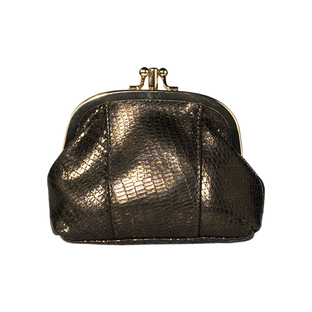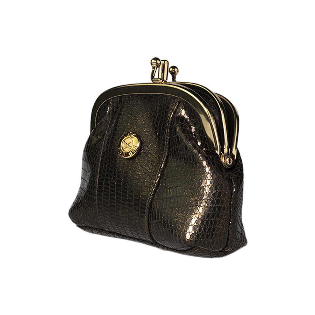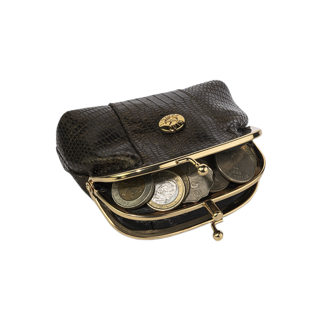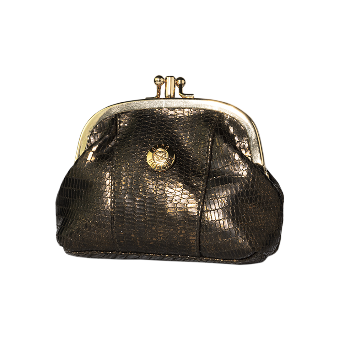 MONEDERO DE CUERO CON MARCO METÁLICO DORADO Y DOS DIVISIONES INTERIORES.