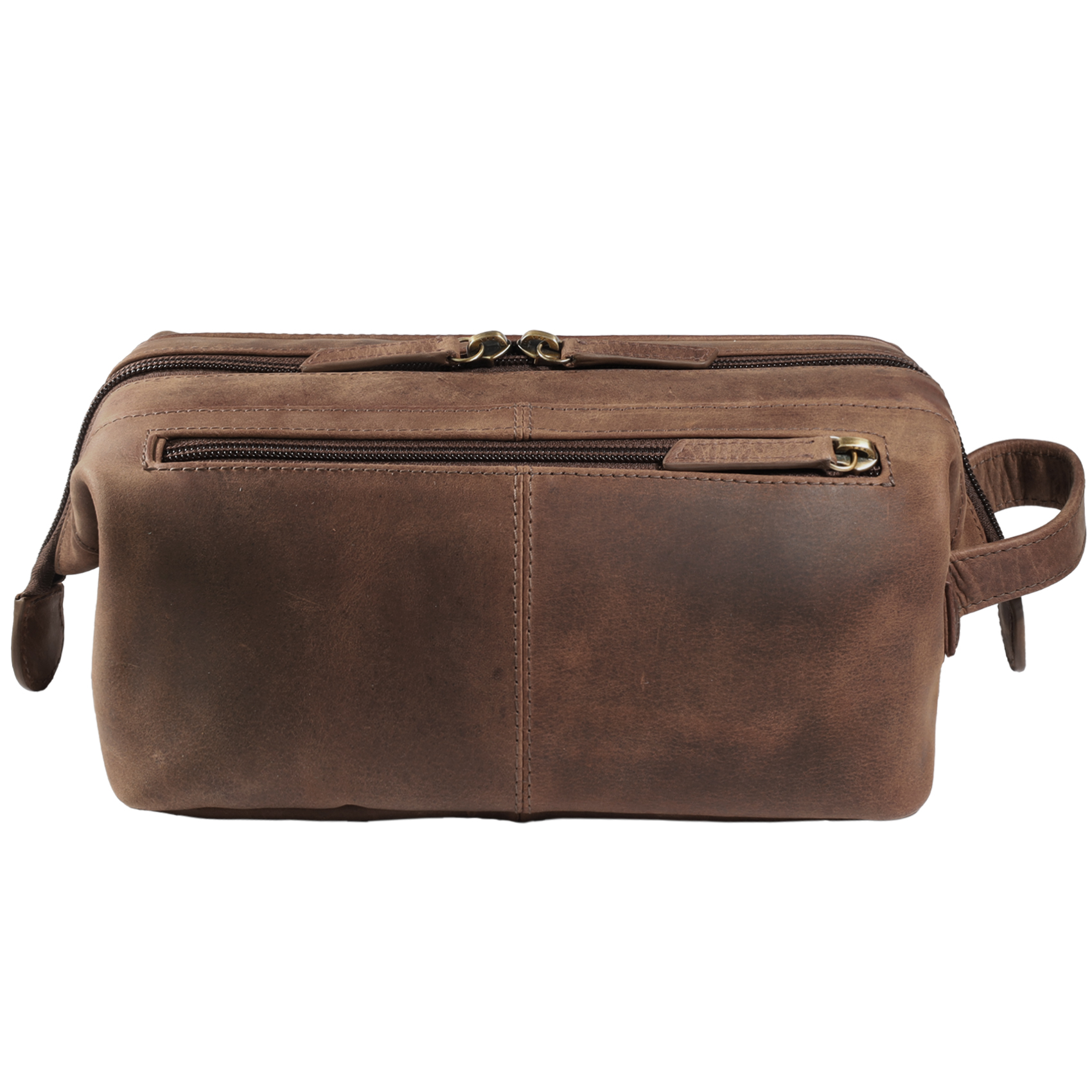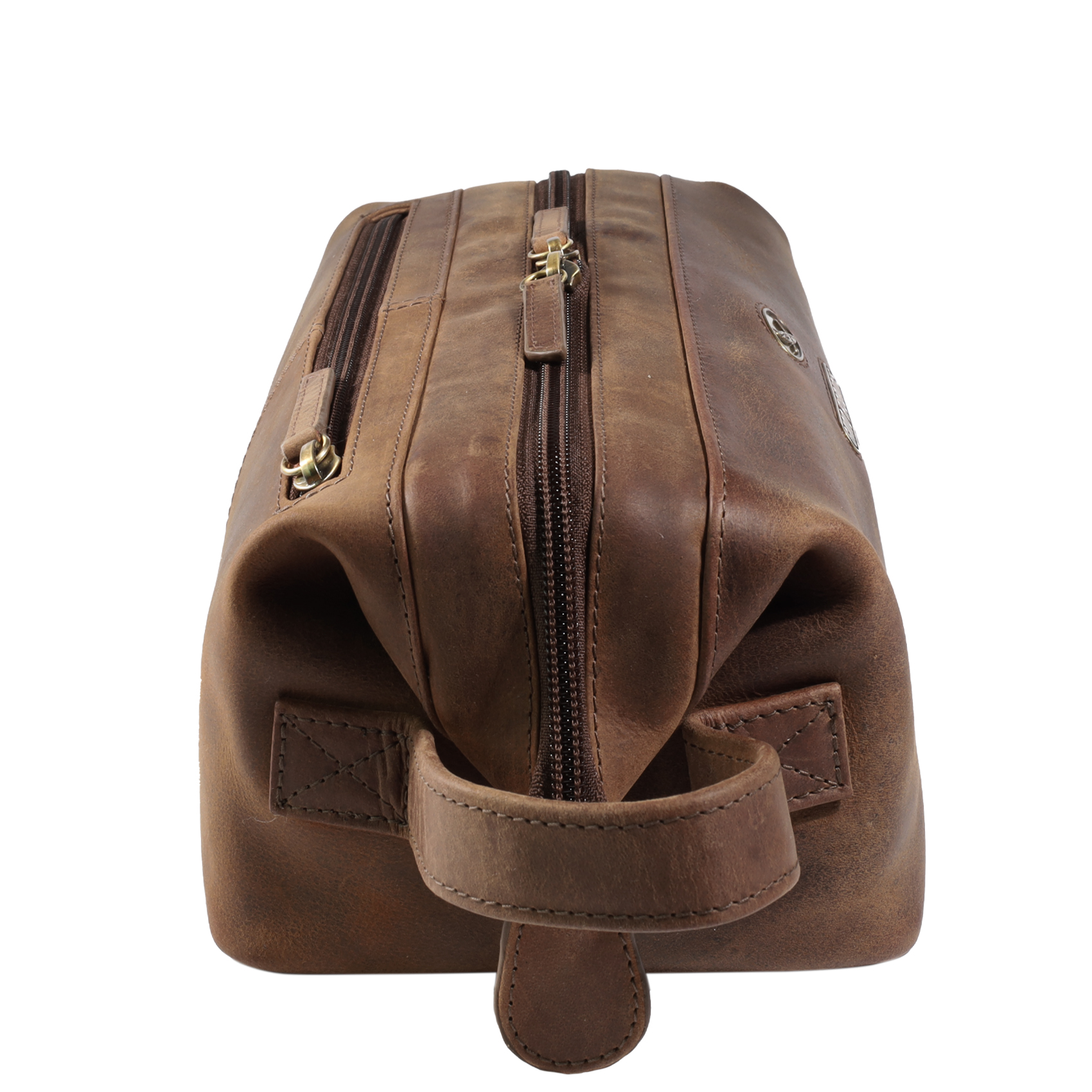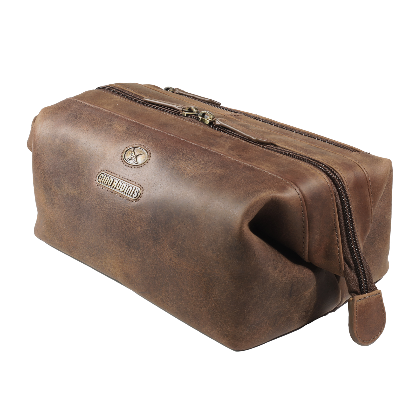 NECESSAIRE DE CUERO CON ESTRUCTURA SUPERIOR CON FLEJES METALICOS Y BOLSILLO EN ZONA POSTERIOR
