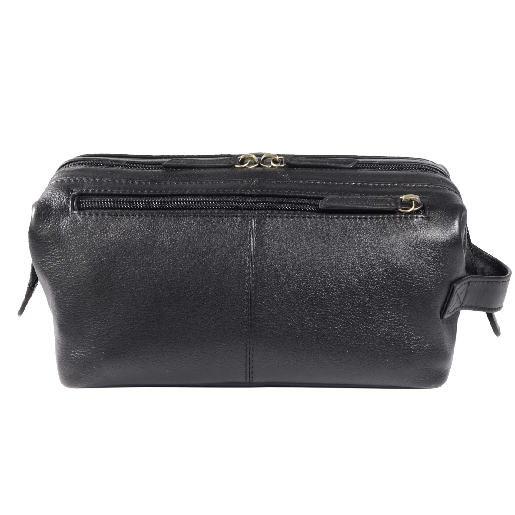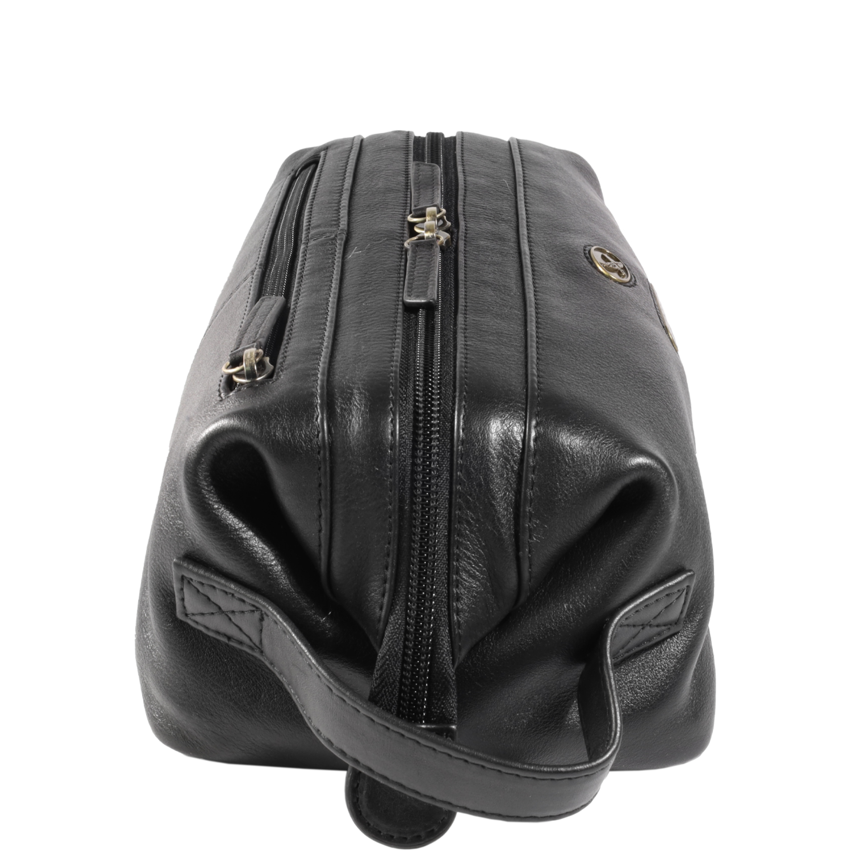 NECESSAIRE DE CUERO CON ESTRUCTURA SUPERIOR CON FLEJES METALICOS Y BOLSILLO EN ZONA POSTERIOR