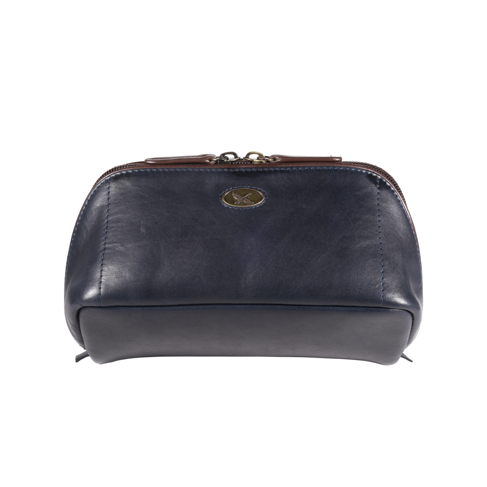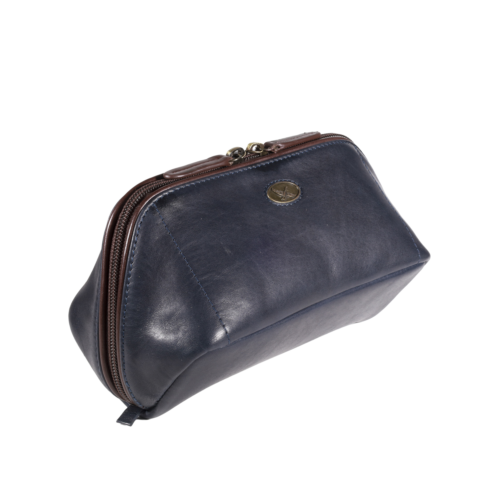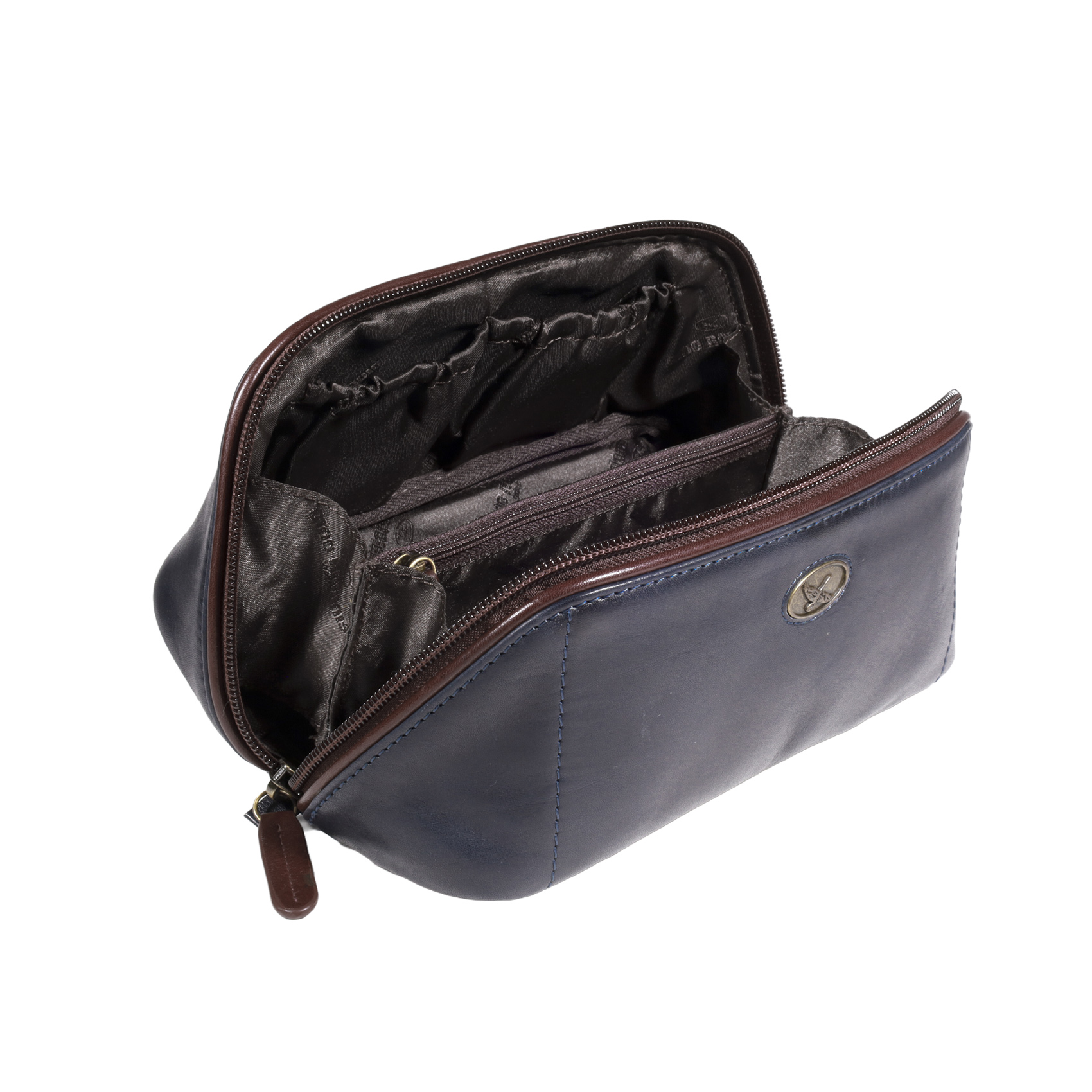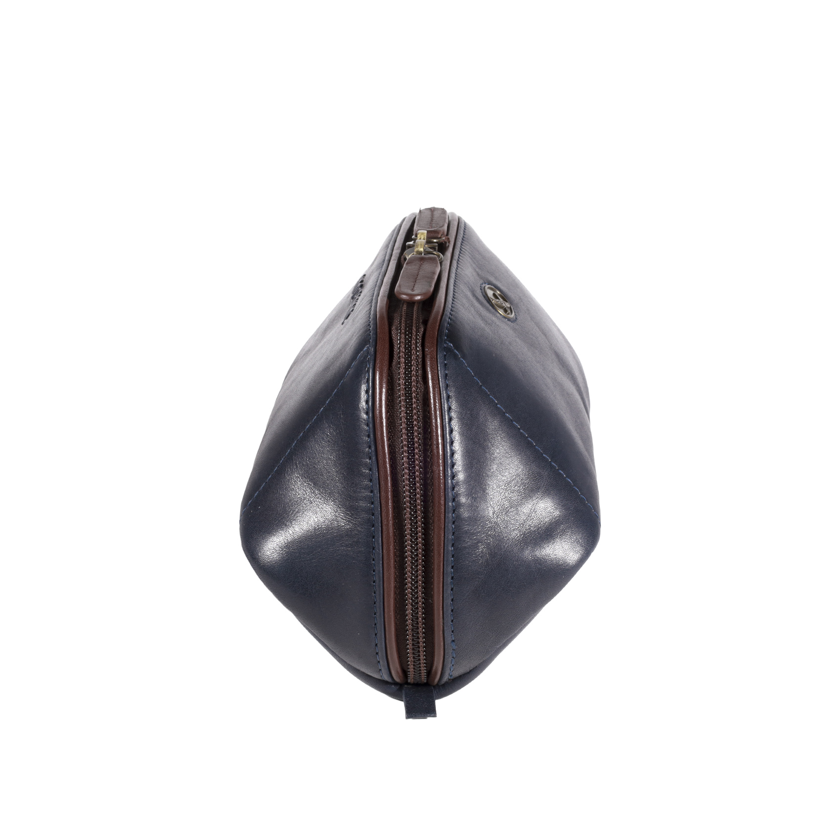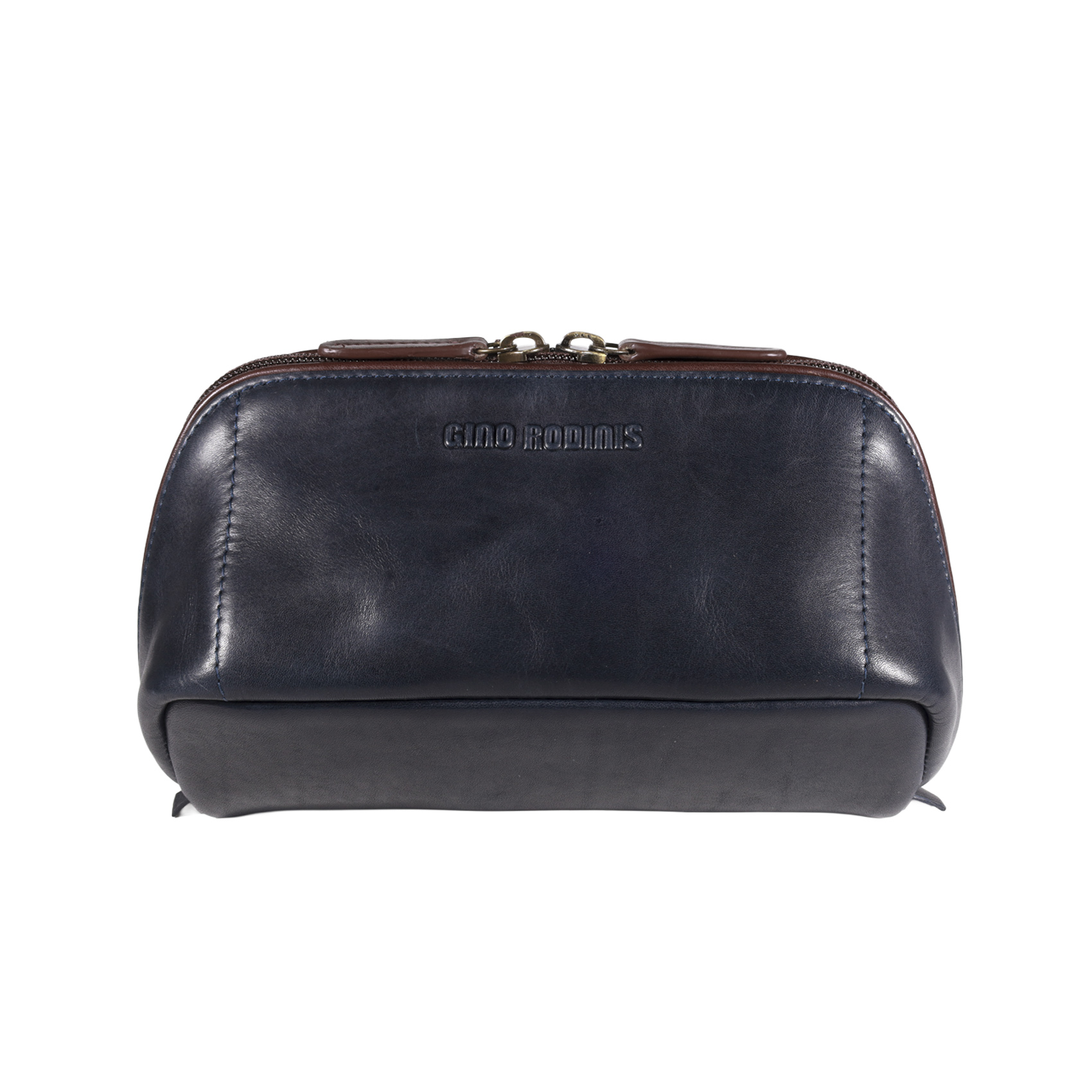 NECESSAIRE DE CUERO CON ESTRUCTURA ROMBOIDE, CIERRE PRINCIPAL DE DOBLE CARRO, INTERIOR DIVIDIDO EN DOS GRANDES ESPACIOS Y TRES BOLSILLOS SIMPLES.