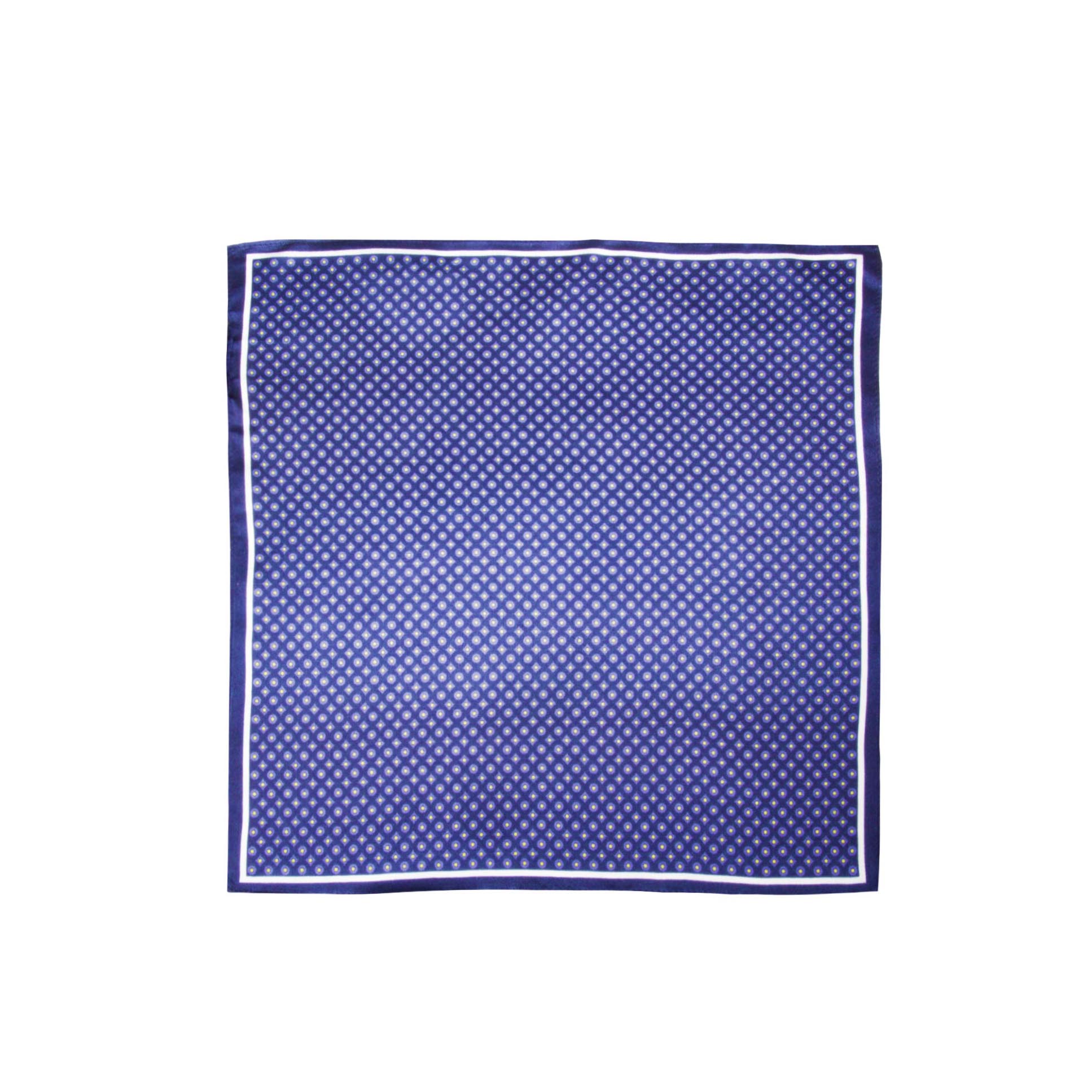 PAÑUELO AZUL, CON DISEÑOS DE CUADRADOS Y CIRCULOS EN TONOS AZULES Y AMARILLOS.