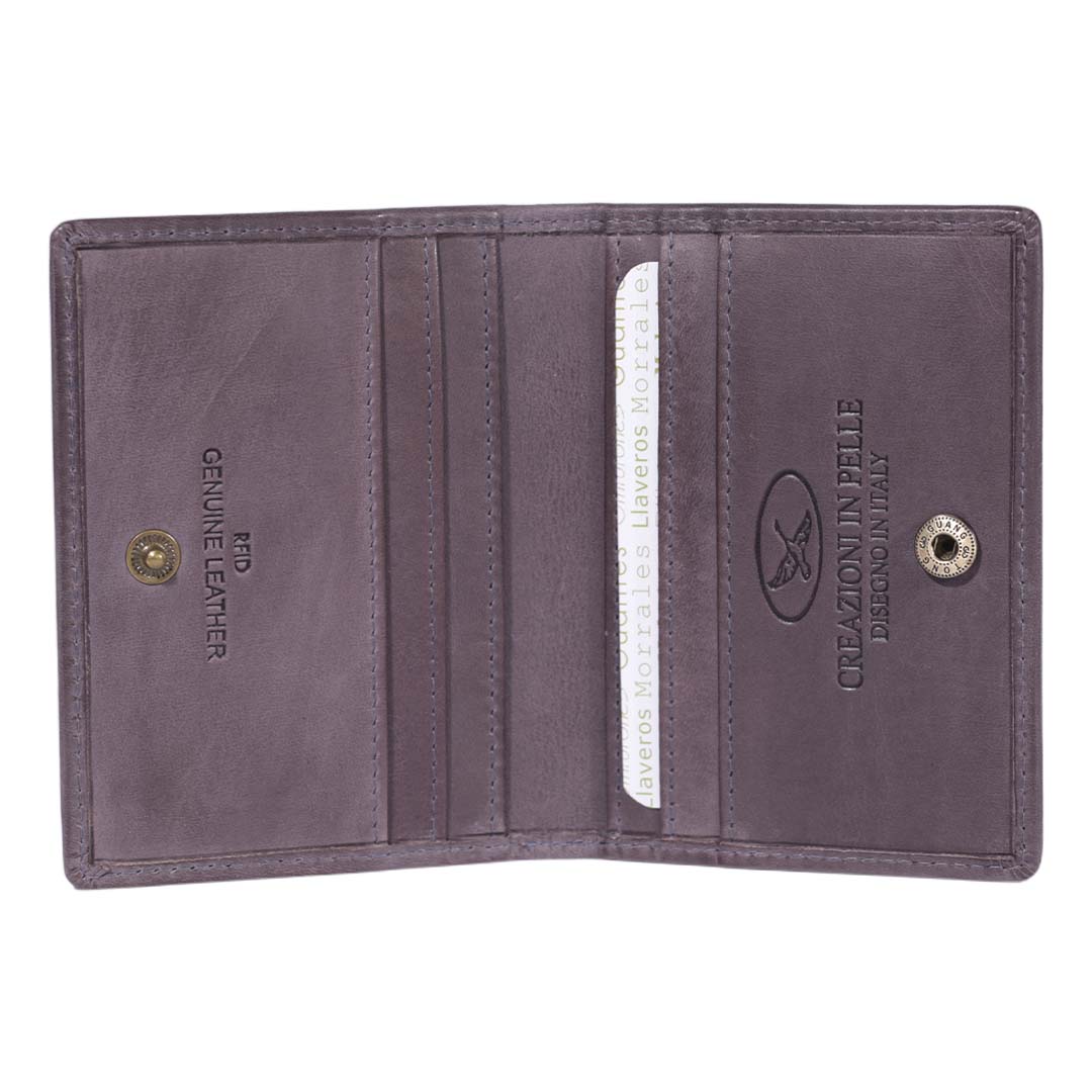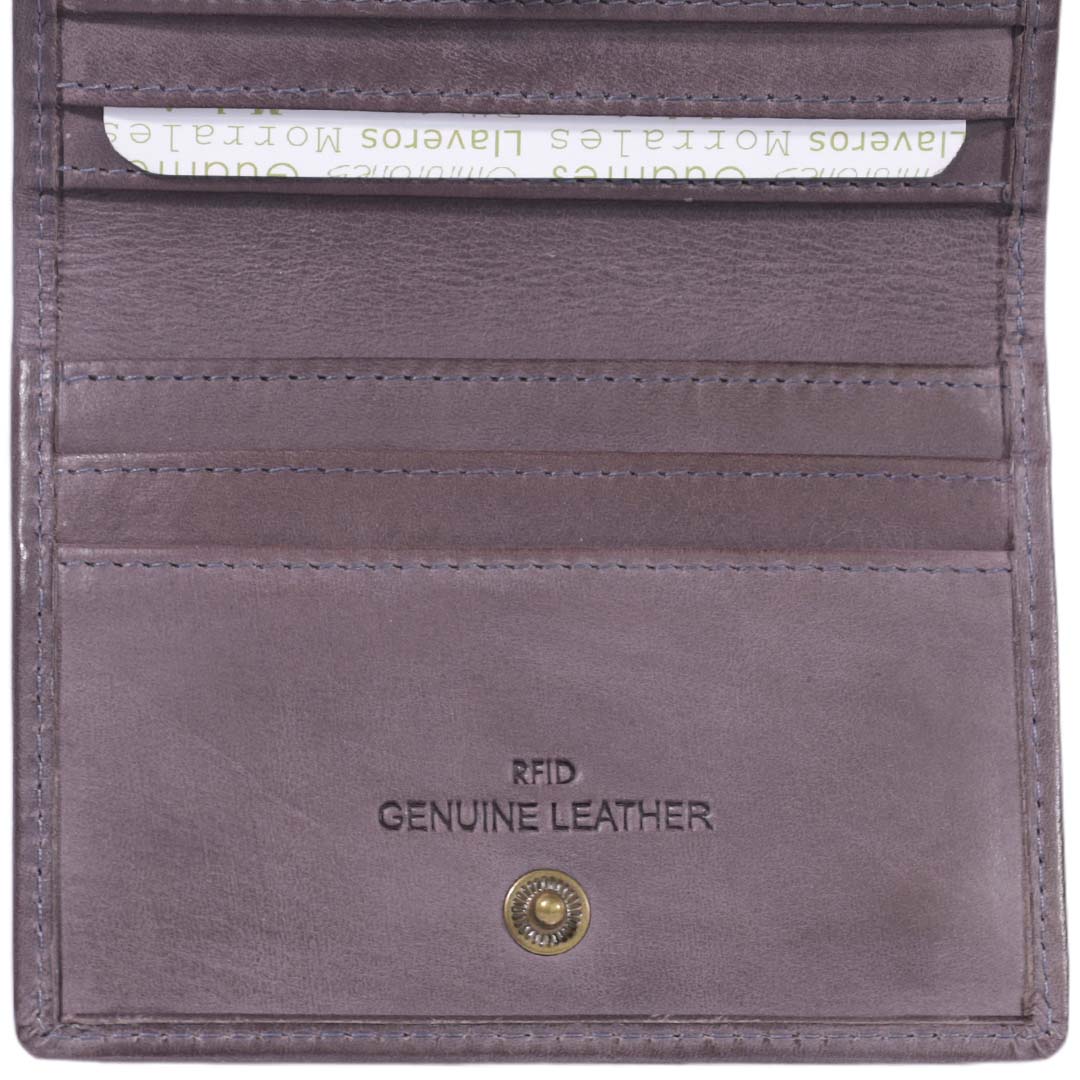 - Tarjetero confeccionado 100% en cuero graso, con bordes pulidos.