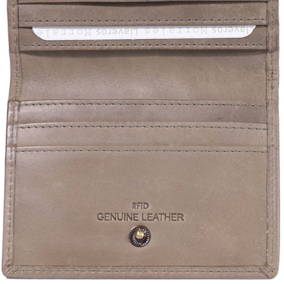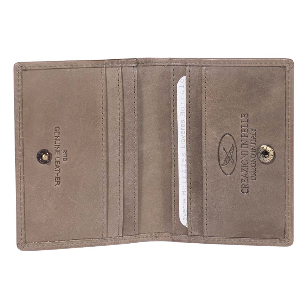 - Tarjetero confeccionado 100% en cuero graso, con bordes pulidos.